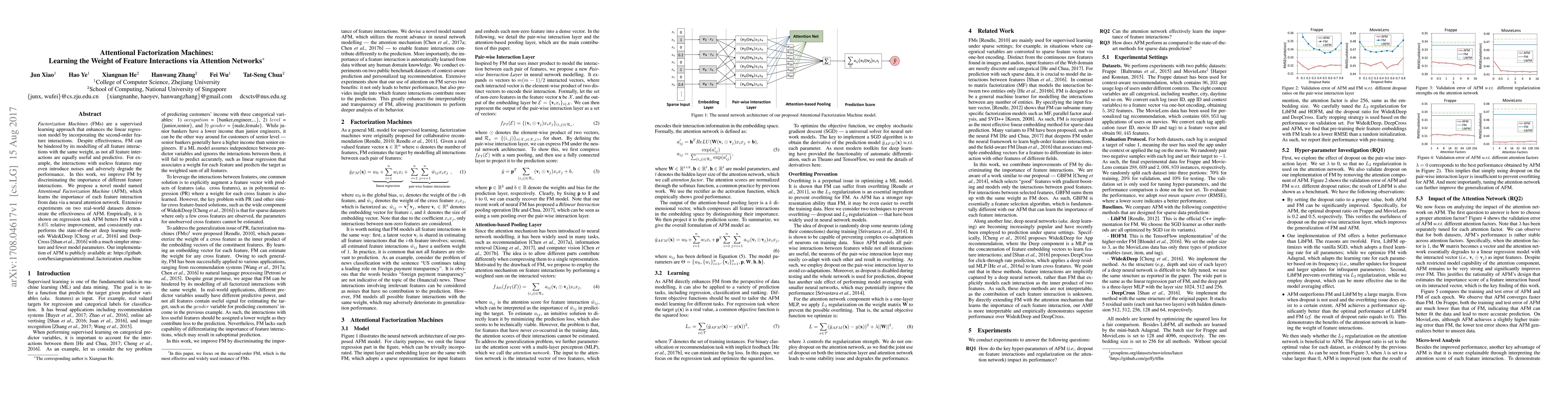 The paper proposes Attentional Factorization Machines (AFM) to improve Factorization Machines (FM) by learning the importance of feature interactions via an attention network, leading to better performance on regression tasks. AFM outperforms FM and state-of-the-art deep learning methods with fewer parameters.