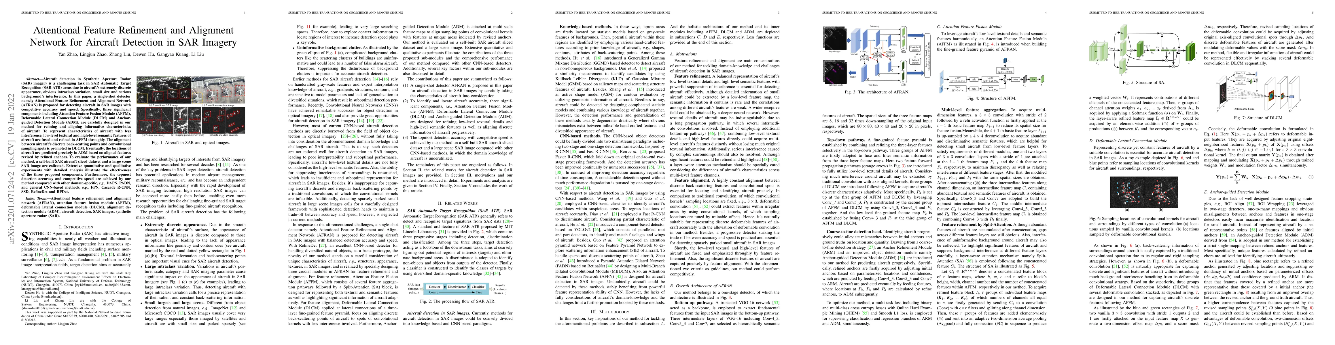 This paper proposes the Attentional Feature Refinement and Alignment Network (AFRAN) for detecting aircraft in Synthetic Aperture Radar (SAR) imagery, utilizing three key components: Attention Feature Fusion Module, Deformable Lateral Connection Module, and Anchor-guided Detection Module to refine and align aircraft features for accurate detection. The method achieves high detection accuracy and speed compared to other SAR and general CNN-based detection methods.