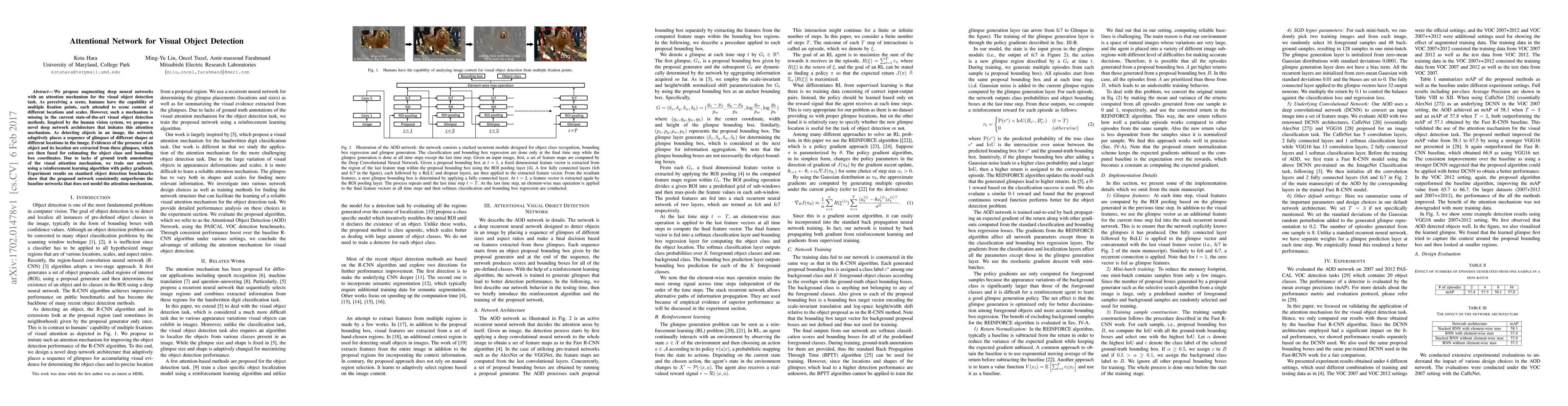 We propose augmenting deep neural networks with an attention mechanism for the visual object detection task. As perceiving a scene, humans have the capability of multiple fixation points, each attended to scene content at different locations and scales. However, such a mechanism is missing in the current state-of-the-art visual object detection methods. Inspired by the human vision system, we propose a novel deep network architecture that imitates this attention mechanism. As detecting objects in an image, the network adaptively places a sequence of glimpses of different shapes at different locations in the image. Evidences of the presence of an object and its location are extracted from these glimpses, which are then fused for estimating the object class and bounding box coordinates. Due to lacks of ground truth annotations of the visual attention mechanism, we train our network using a reinforcement learning algorithm with policy gradients. Experiment results on standard object detection benchmarks show that the proposed network consistently outperforms the baseline networks that does not model the attention mechanism.