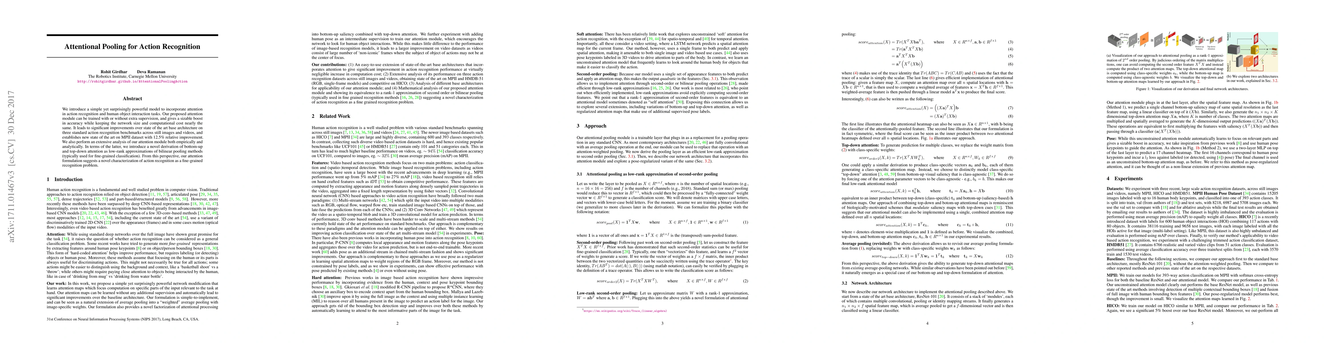 This paper proposes an attentional pooling model that significantly enhances action recognition and human-object interaction tasks, achieving state-of-the-art results with minimal increase in network size and computational cost. The attention module, which can be trained with or without extra supervision, offers substantial improvements over existing architectures on multiple benchmarks.
