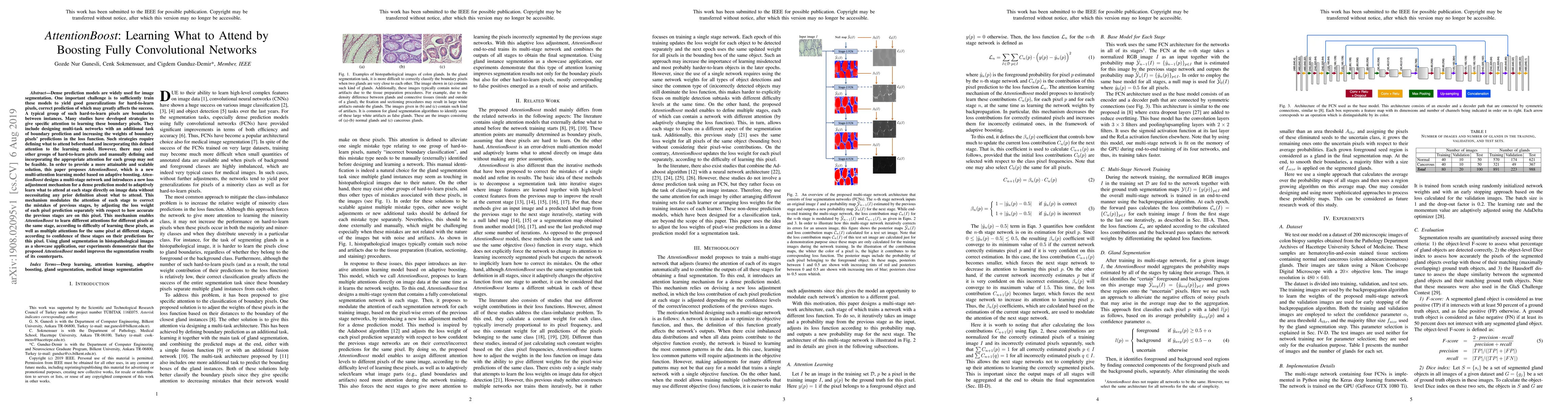 Dense prediction models are widely used for image segmentation. One important challenge is to sufficiently train these models to yield good generalizations for hard-to-learn pixels. A typical group of such hard-to-learn pixels are boundaries between instances. Many studies have proposed to give specific attention to learning the boundary pixels. They include designing multi-task networks with an additional task of boundary prediction and increasing the weights of boundary pixels' predictions in the loss function. Such strategies require defining what to attend beforehand and incorporating this defined attention to the learning model. However, there may exist other groups of hard-to-learn pixels and manually defining and incorporating the appropriate attention for each group may not be feasible. In order to provide a more attainable and scalable solution, this paper proposes AttentionBoost, which is a new multi-attention learning model based on adaptive boosting. AttentionBoost designs a multi-stage network and introduces a new loss adjustment mechanism for a dense prediction model to adaptively learn what to attend at each stage directly on image data without necessitating any prior definition about what to attend. This mechanism modulates the attention of each stage to correct the mistakes of previous stages, by adjusting the loss weight of each pixel prediction separately with respect to how accurate the previous stages are on this pixel. This mechanism enables AttentionBoost to learn different attentions for different pixels at the same stage, according to difficulty of learning these pixels, as well as multiple attentions for the same pixel at different stages, according to confidence of these stages on their predictions for this pixel. Using gland segmentation as a showcase application, our experiments demonstrate that AttentionBoost improves the results of its counterparts.