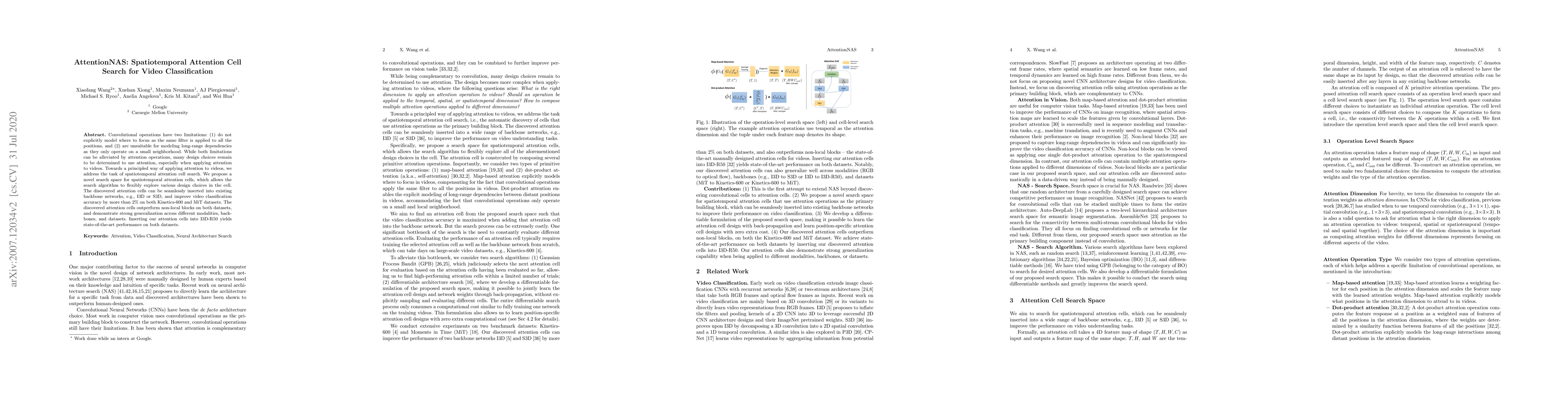 The paper proposes a novel spatiotemporal attention cell search method to address limitations of convolutional operations in video classification. The method introduces a flexible search space for attention cells that enhance existing networks like I3D or S3D, achieving over 2% improvement in accuracy on Kinetics-600 and MiT datasets, and outperforming non-local blocks.