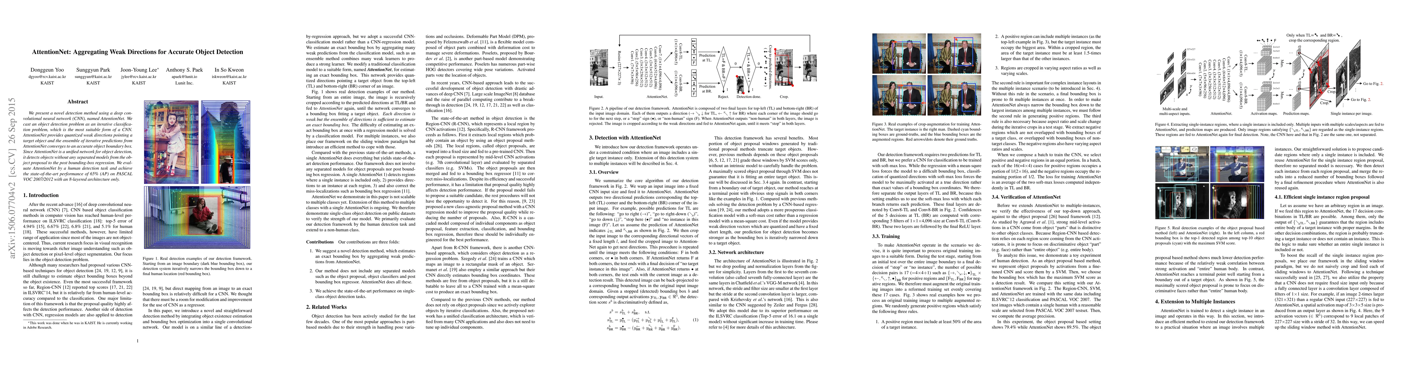 AttentionNet uses a deep CNN to detect objects by aggregating weak directions, achieving state-of-the-art performance of 65% (AP) on PASCAL VOC 2007/2012.