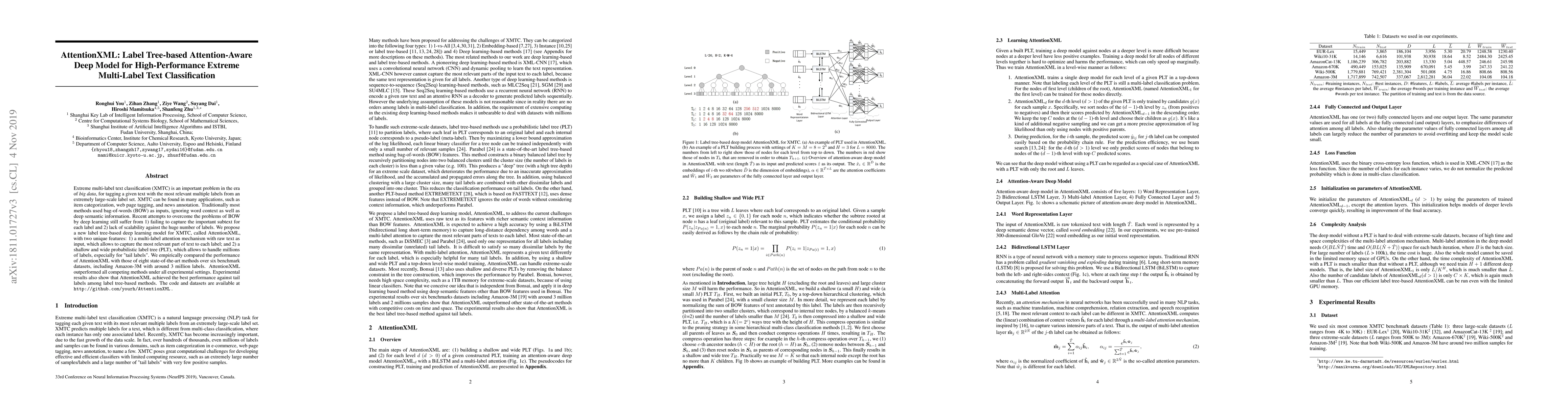 The paper proposes AttentionXML, a label tree-based deep learning model for extreme multi-label text classification, featuring a multi-label attention mechanism and a probabilistic label tree to handle large label sets. Experimental results show that AttentionXML outperforms state-of-the-art methods across multiple datasets, especially for "tail labels."