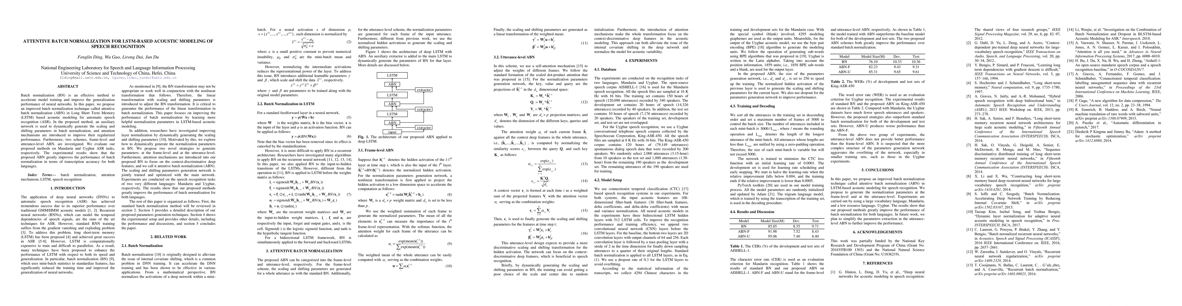 This paper proposes attentive batch normalization (ABN) for LSTM-based acoustic modeling in automatic speech recognition, introducing an auxiliary network to dynamically generate scaling and shifting parameters. Experiments on Mandarin and Uyghur ASR tasks demonstrate significant improvements in transcription accuracy.