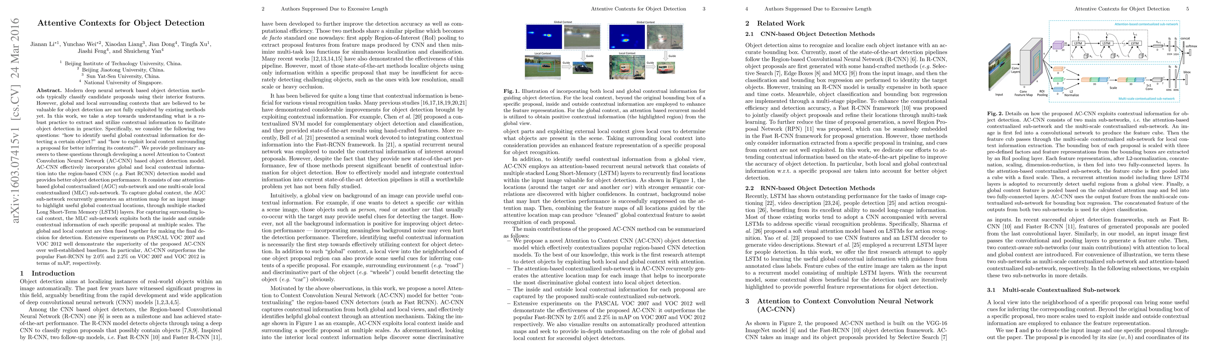 Modern deep neural network based object detection methods typically classify candidate proposals using their interior features. However, global and local surrounding contexts that are believed to be valuable for object detection are not fully exploited by existing methods yet. In this work, we take a step towards understanding what is a robust practice to extract and utilize contextual information to facilitate object detection in practice. Specifically, we consider the following two questions: "how to identify useful global contextual information for detecting a certain object?" and "how to exploit local context surrounding a proposal for better inferring its contents?". We provide preliminary answers to these questions through developing a novel Attention to Context Convolution Neural Network (AC-CNN) based object detection model. AC-CNN effectively incorporates global and local contextual information into the region-based CNN (e.g. Fast RCNN) detection model and provides better object detection performance. It consists of one attention-based global contextualized (AGC) sub-network and one multi-scale local contextualized (MLC) sub-network. To capture global context, the AGC sub-network recurrently generates an attention map for an input image to highlight useful global contextual locations, through multiple stacked Long Short-Term Memory (LSTM) layers. For capturing surrounding local context, the MLC sub-network exploits both the inside and outside contextual information of each specific proposal at multiple scales. The global and local context are then fused together for making the final decision for detection. Extensive experiments on PASCAL VOC 2007 and VOC 2012 well demonstrate the superiority of the proposed AC-CNN over well-established baselines. In particular, AC-CNN outperforms the popular Fast-RCNN by 2.0% and 2.2% on VOC 2007 and VOC 2012 in terms of mAP, respectively.