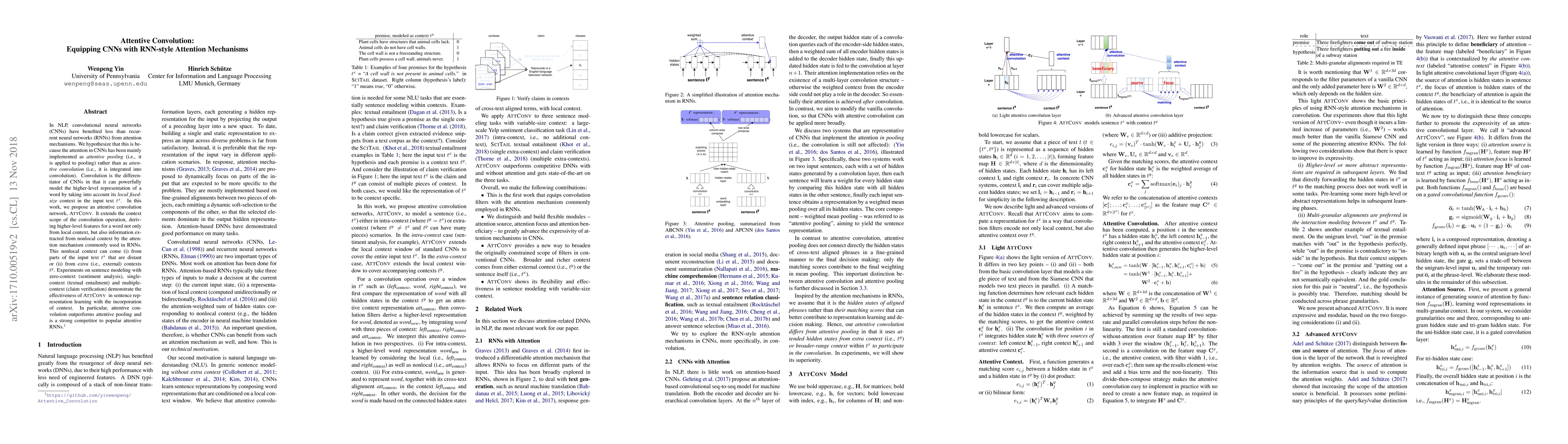 In NLP, convolutional neural networks (CNNs) have benefited less than recurrent neural networks (RNNs) from attention mechanisms. We hypothesize that this is because the attention in CNNs has been mainly implemented as attentive pooling (i.e., it is applied to pooling) rather than as attentive convolution (i.e., it is integrated into convolution). Convolution is the differentiator of CNNs in that it can powerfully model the higher-level representation of a word by taking into account its local fixed-size context in the input text t^x. In this work, we propose an attentive convolution network, ATTCONV. It extends the context scope of the convolution operation, deriving higher-level features for a word not only from local context, but also information extracted from nonlocal context by the attention mechanism commonly used in RNNs. This nonlocal context can come (i) from parts of the input text t^x that are distant or (ii) from extra (i.e., external) contexts t^y. Experiments on sentence modeling with zero-context (sentiment analysis), single-context (textual entailment) and multiple-context (claim verification) demonstrate the effectiveness of ATTCONV in sentence representation learning with the incorporation of context. In particular, attentive convolution outperforms attentive pooling and is a strong competitor to popular attentive RNNs.