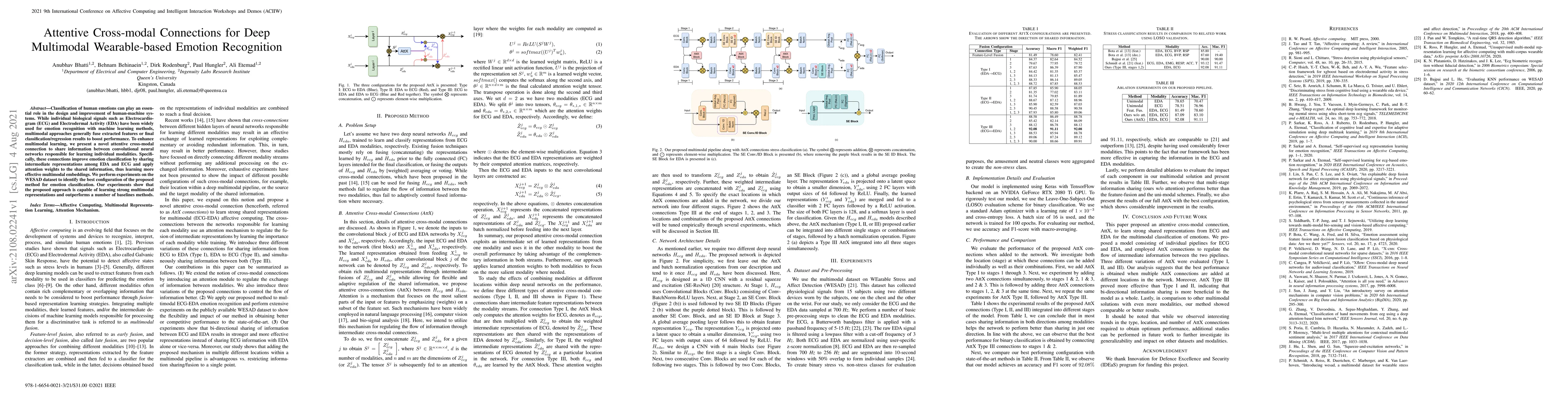 This paper proposes an attentive cross-modal connection to enhance multimodal learning for emotion recognition using wearable devices. The method shares intermediate representations between ECG and EDA signals through convolutional neural networks, applying attention weights to improve classification performance, and outperforms baseline methods on the WESAD dataset.