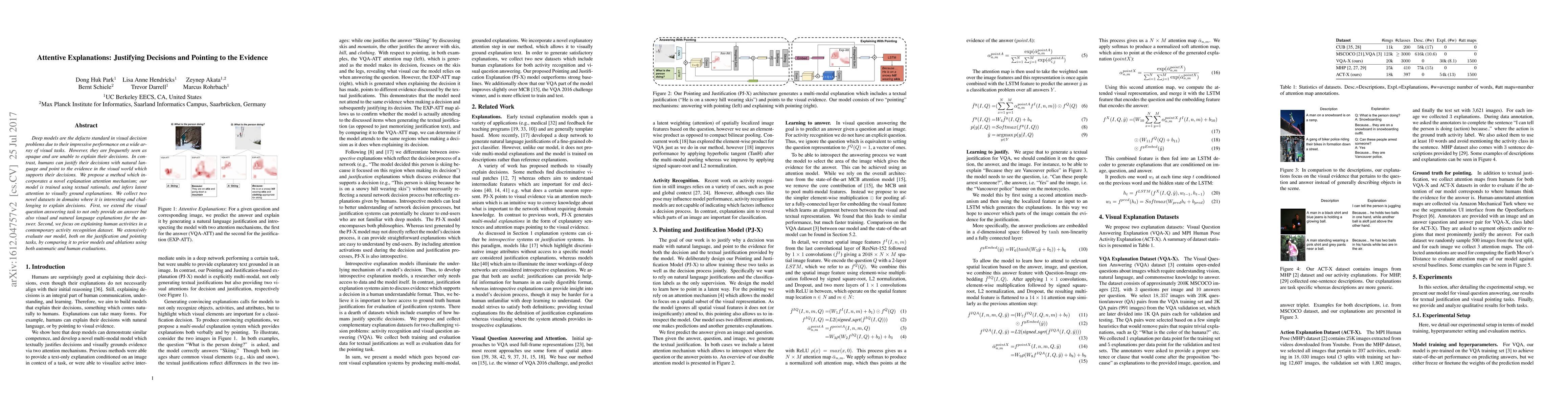 Deep models are the defacto standard in visual decision models due to their impressive performance on a wide array of visual tasks. However, they are frequently seen as opaque and are unable to explain their decisions. In contrast, humans can justify their decisions with natural language and point to the evidence in the visual world which led to their decisions. We postulate that deep models can do this as well and propose our Pointing and Justification (PJ-X) model which can justify its decision with a sentence and point to the evidence by introspecting its decision and explanation process using an attention mechanism. Unfortunately there is no dataset available with reference explanations for visual decision making. We thus collect two datasets in two domains where it is interesting and challenging to explain decisions. First, we extend the visual question answering task to not only provide an answer but also a natural language explanation for the answer. Second, we focus on explaining human activities which is traditionally more challenging than object classification. We extensively evaluate our PJ-X model, both on the justification and pointing tasks, by comparing it to prior models and ablations using both automatic and human evaluations.