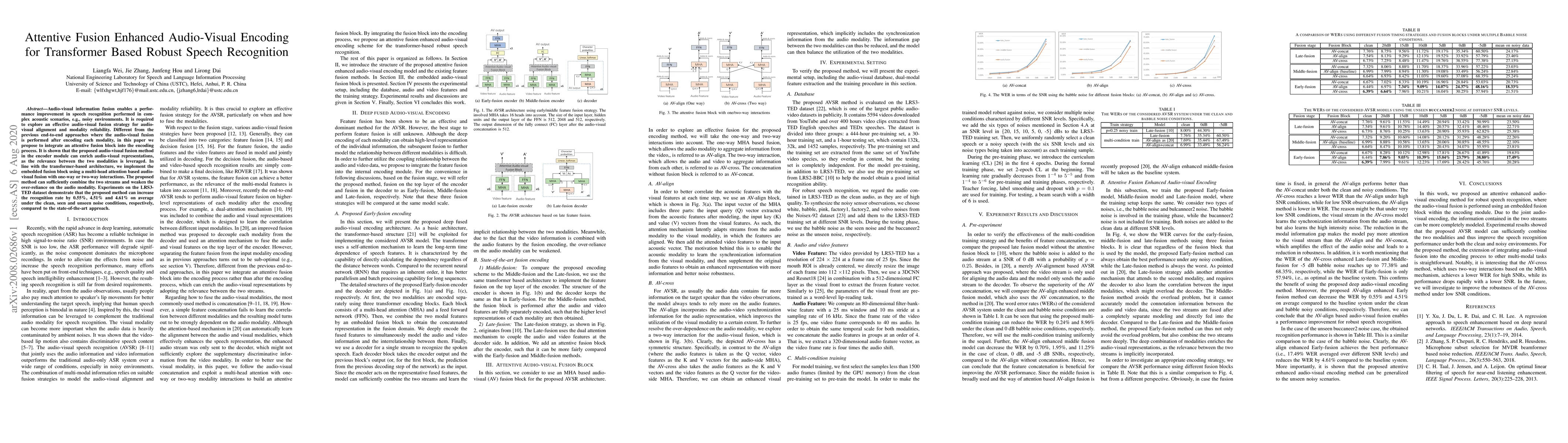 This paper proposes an attentive fusion block integrated into the encoder of a transformer-based speech recognition model to enhance audio-visual encoding. The method improves speech recognition performance in noisy environments by enriching audio-visual representations and reducing over-reliance on audio, achieving notable improvements in recognition rates across various noise conditions.