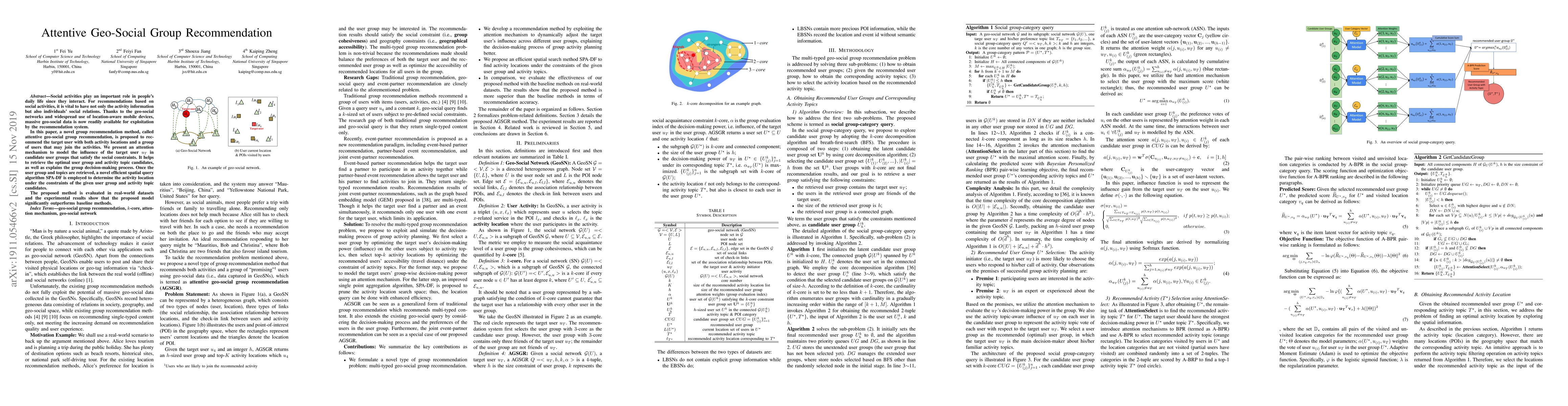 This paper proposes a novel attentive geo-social group recommendation method that recommends activity locations and suitable user groups based on social relations and geo-social data. It employs an attention mechanism to model the influence of the target user and an efficient spatial query algorithm to determine optimal activity locations. The method outperforms baselines in real-world datasets.