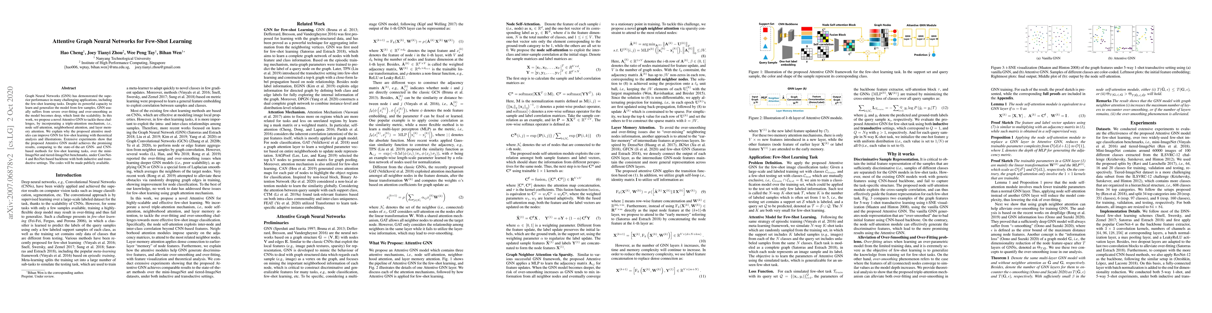 This paper proposes an Attentive Graph Neural Network (GNN) to enhance few-shot learning, addressing overfitting and over-smoothing through a triple-attention mechanism. Experimental results demonstrate superior performance over existing GNN and CNN-based methods on mini-ImageNet and tiered-ImageNet benchmarks.