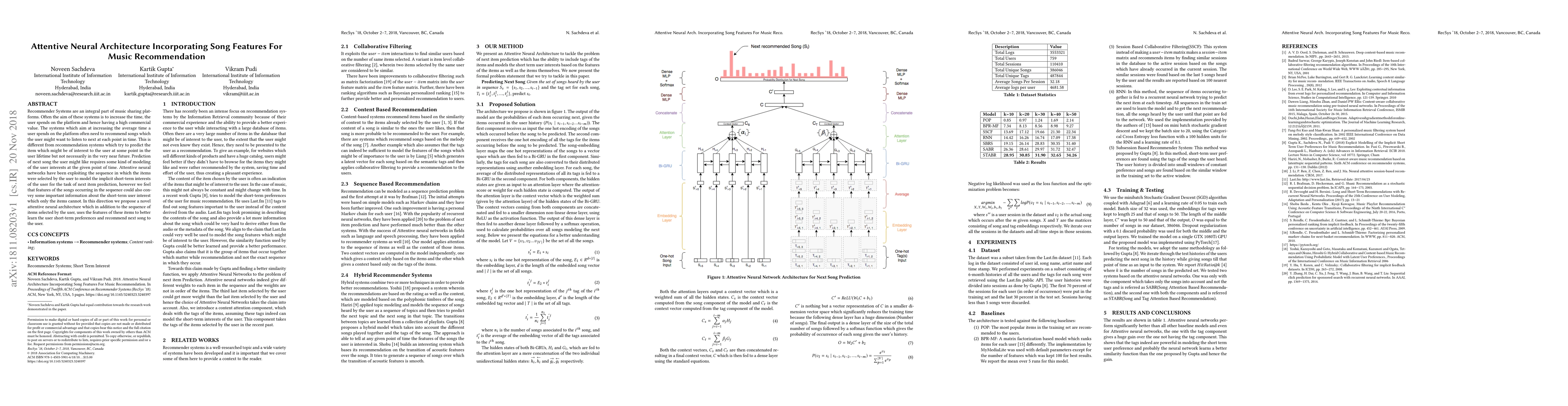 This paper proposes an attentive neural architecture for music recommendation systems that incorporates both user listening history and song features to model short-term user interests and predict the next song a user might like. The approach aims to enhance the recommendation quality by leveraging song attributes alongside sequential user behavior.