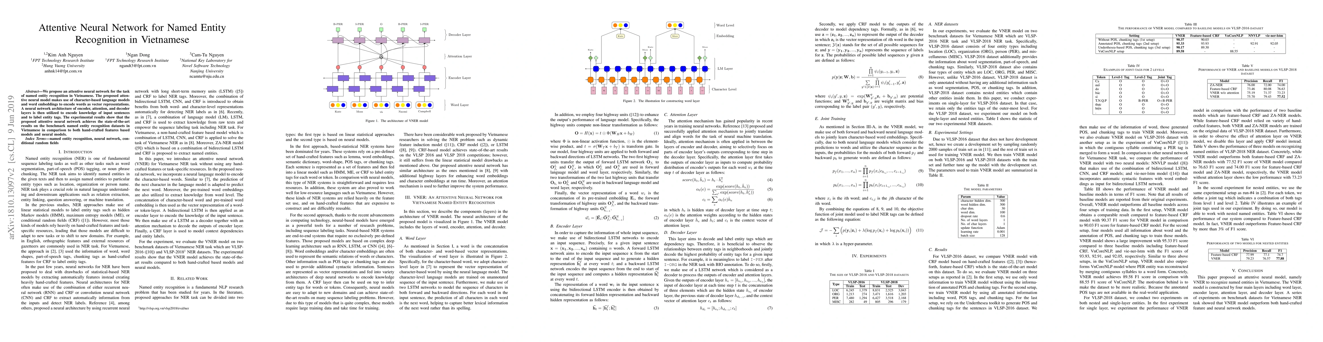The paper introduces an attentive neural network leveraging character-based models and word embeddings for Vietnamese named entity recognition, achieving top performance on benchmark datasets compared to both traditional and other neural models. The proposed architecture includes encoder, attention, and decoder layers for effective sentence encoding and entity tagging.
