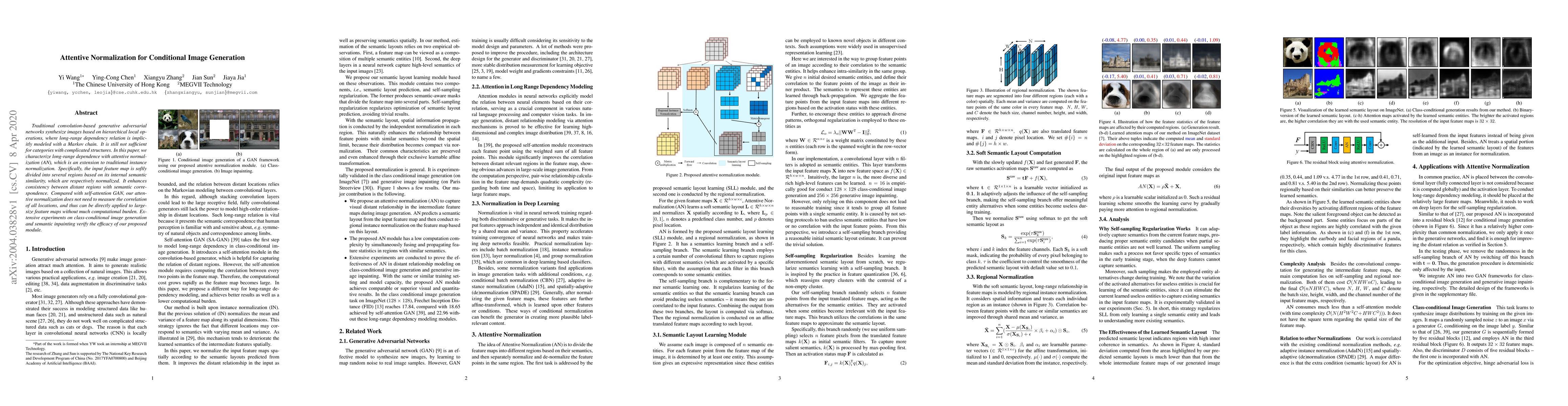 The paper proposes Attentive Normalization (AN) for conditional image generation, extending traditional instance normalization by dividing feature maps into semantically similar regions for normalization, enhancing distant region consistency.