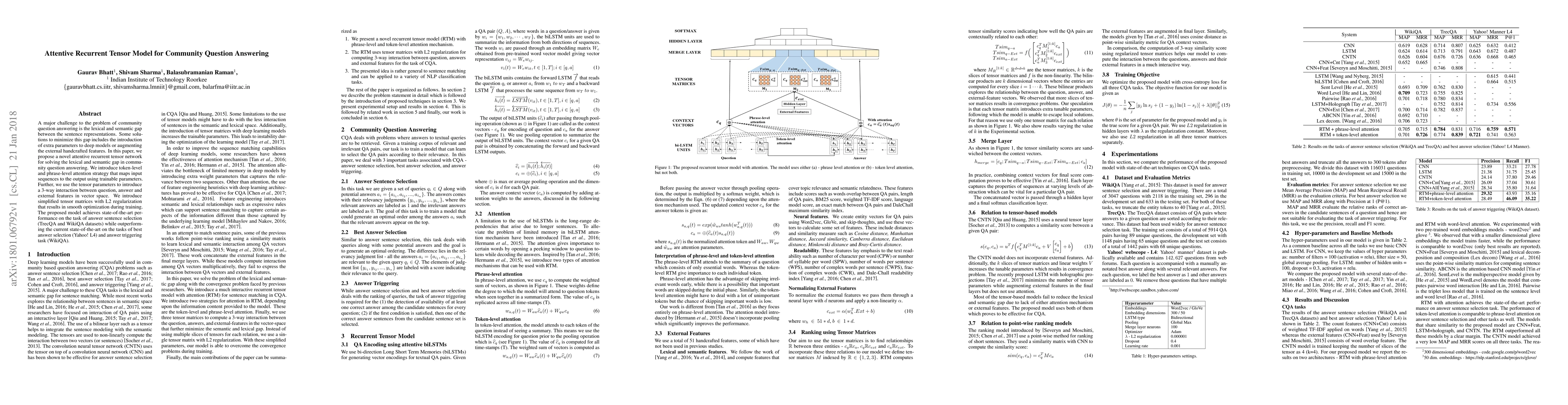 This paper introduces an attentive recurrent tensor model to address the lexical and semantic gap in community question answering. The model employs token-level and phrase-level attention mechanisms and tensor parameters for 3-way interactions, achieving state-of-the-art performance on various datasets.