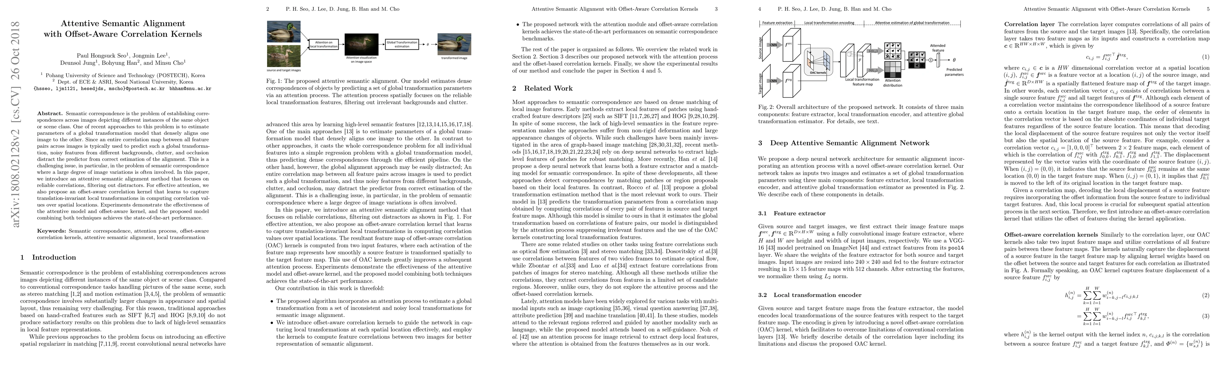 Semantic correspondence is the problem of establishing correspondences across images depicting different instances of the same object or scene class. One of recent approaches to this problem is to estimate parameters of a global transformation model that densely aligns one image to the other. Since an entire correlation map between all feature pairs across images is typically used to predict such a global transformation, noisy features from different backgrounds, clutter, and occlusion distract the predictor from correct estimation of the alignment. This is a challenging issue, in particular, in the problem of semantic correspondence where a large degree of image variations is often involved. In this paper, we introduce an attentive semantic alignment method that focuses on reliable correlations, filtering out distractors. For effective attention, we also propose an offset-aware correlation kernel that learns to capture translation-invariant local transformations in computing correlation values over spatial locations. Experiments demonstrate the effectiveness of the attentive model and offset-aware kernel, and the proposed model combining both techniques achieves the state-of-the-art performance.