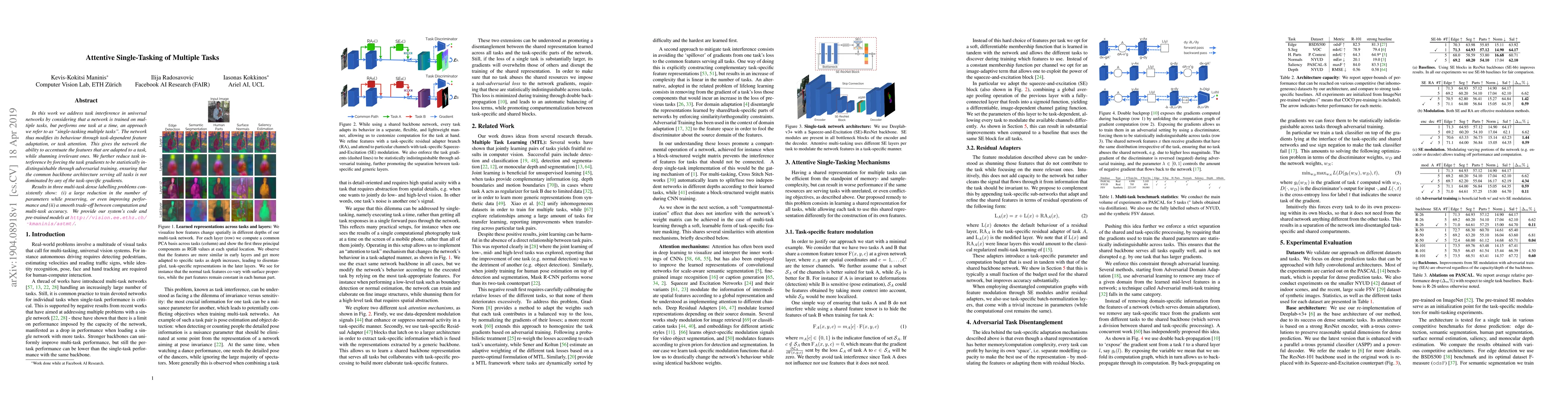 This paper proposes "single-tasking multiple tasks" to reduce interference in universal networks trained on multiple tasks, employing task-dependent feature adaptation and adversarial training. Results show significant parameter reduction and improved performance in multi-task dense labelling problems.