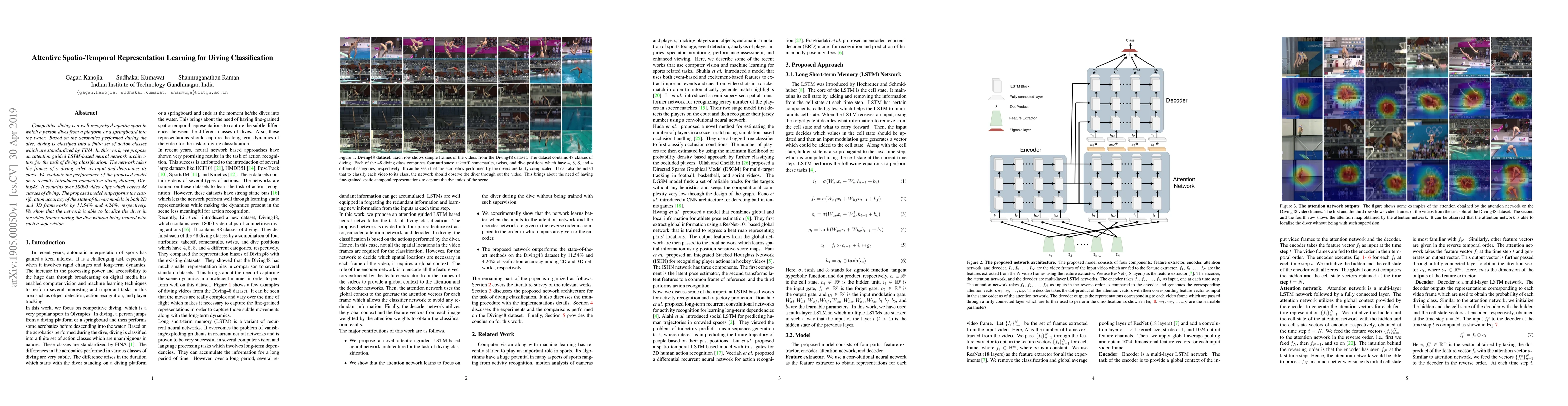 The paper proposes an attention-guided LSTM-based neural network architecture for diving classification. It consists of a feature extractor, encoder, attention network, and decoder. The model uses ResNet (18 layers) as the feature extractor and trains on the Diving48 dataset, which contains 18,400 video clips across 48 diving classes.
