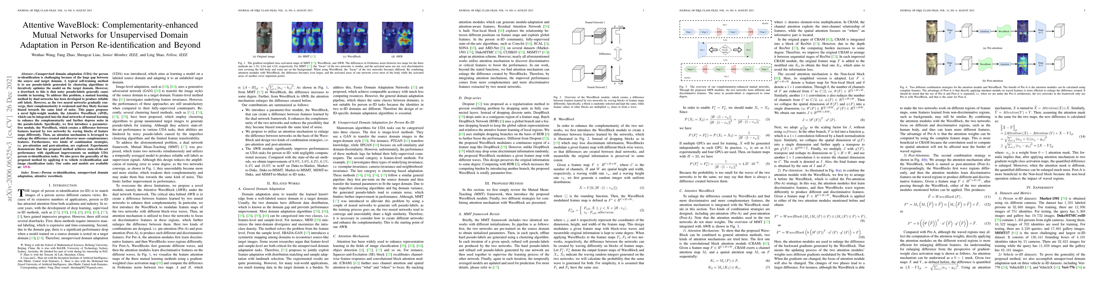 This paper proposes the Attentive WaveBlock (AWB) module to enhance mutual learning in dual networks for unsupervised domain adaptation, particularly for person re-identification. The AWB integrates a WaveBlock to create feature differences and an attention mechanism to amplify complementary features, improving label reliability and reducing noise. The method achieves state-of-the-art performance in person re-identification and generalizes to vehicle re-identification and image classification.