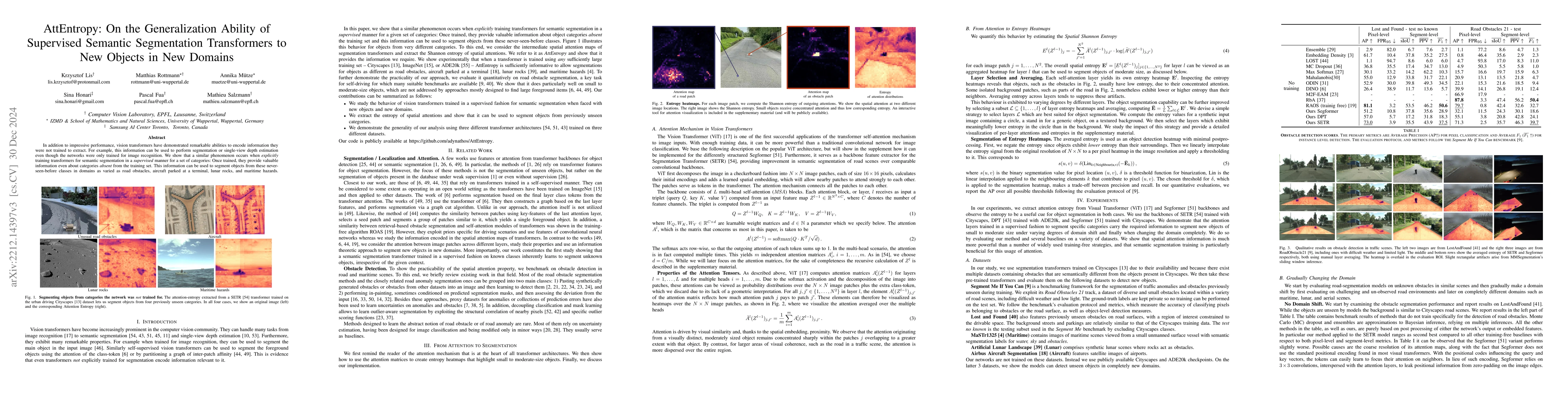 This paper explores the spatial attention entropy of semantic segmentation transformers to segment unknown objects in complex scenes. The study reveals that attention within object patches is concentrated, while larger, uniform areas exhibit diffusive attention, enabling the segmentation of unexpected objects without additional training.