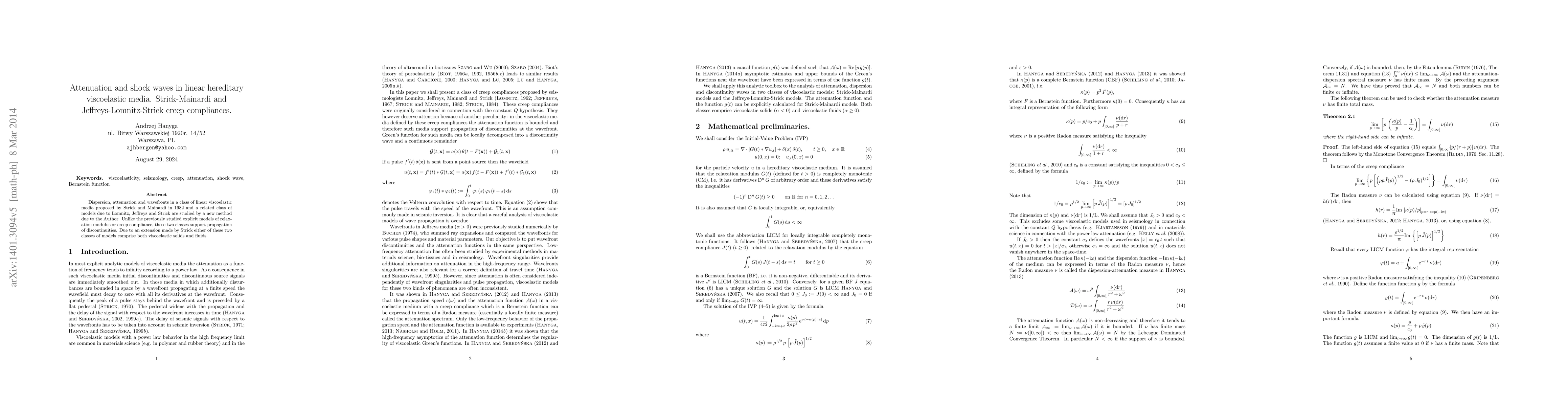 This paper investigates dispersion, attenuation, and shock waves in linear hereditary viscoelastic media, focusing on the Strick-Mainardi and Jeffreys-Lomnitz-Strick models. The author employs a novel method to study these models, which support the propagation of discontinuities and can represent both viscoelastic solids and fluids.