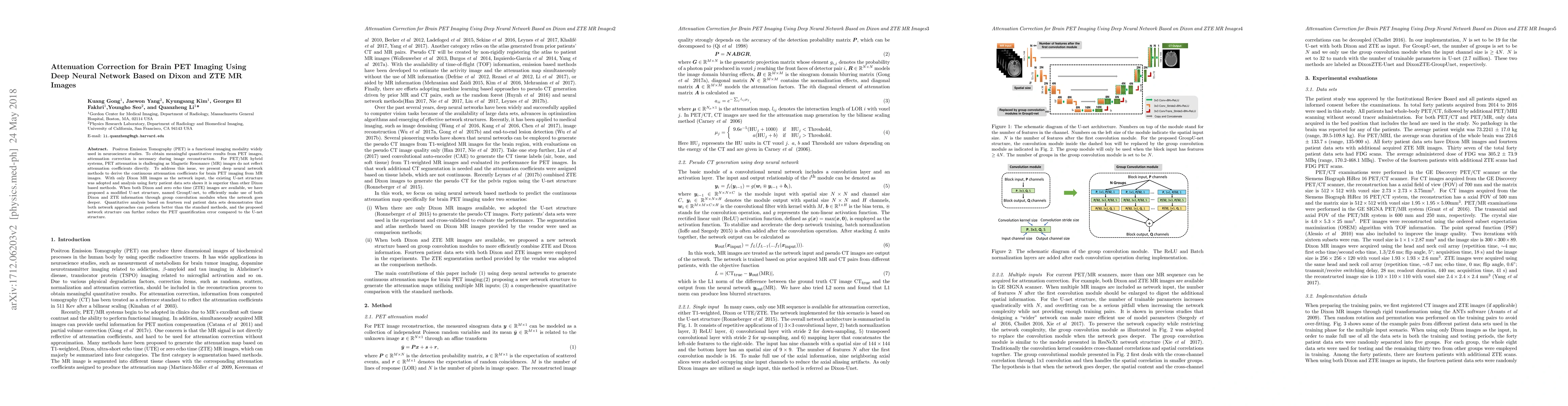 This paper proposes deep neural network methods to derive attenuation coefficients for brain PET imaging using MR images, specifically employing U-net and a modified GroupU-net structure that utilizes both Dixon and ZTE MR images. The results show superior performance over standard methods in reducing PET quantification error.