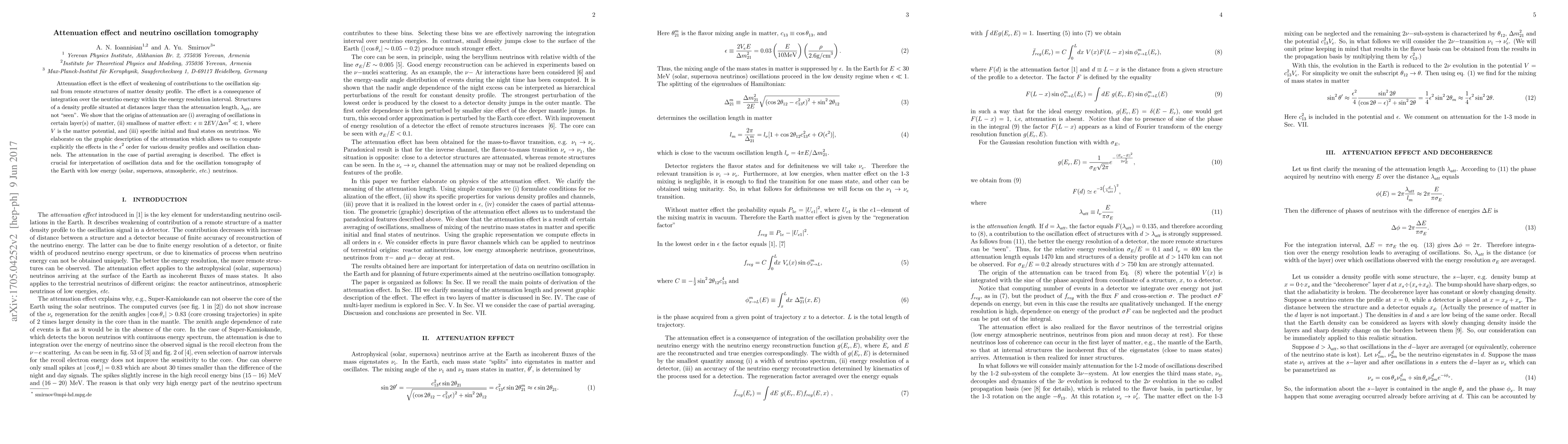 Attenuation effect is the effect of weakening of contributions to the oscillation signal from remote structures of matter density profile. The effect is a consequence of integration over the neutrino energy within the energy resolution interval. Structures of a density profile situated at distances larger than the attenuation length, $\lambda_{att}$, are not "seen". We show that the origins of attenuation are (i) averaging of oscillations in certain layer(s) of matter, (ii) smallness of matter effect: $\epsilon \equiv 2EV/\Delta m^2 \ll 1$, where $V$ is the matter potential, and (iii) specific initial and final states on neutrinos. We elaborate on the graphic description of the attenuation which allows us to compute explicitly the effects in the $\epsilon^2$ order for various density profiles and oscillation channels. The attenuation in the case of partial averaging is described. The effect is crucial for interpretation of oscillation data and for the oscillation tomography of the Earth with low energy (solar, supernova, atmospheric, {\it etc.}) neutrinos.