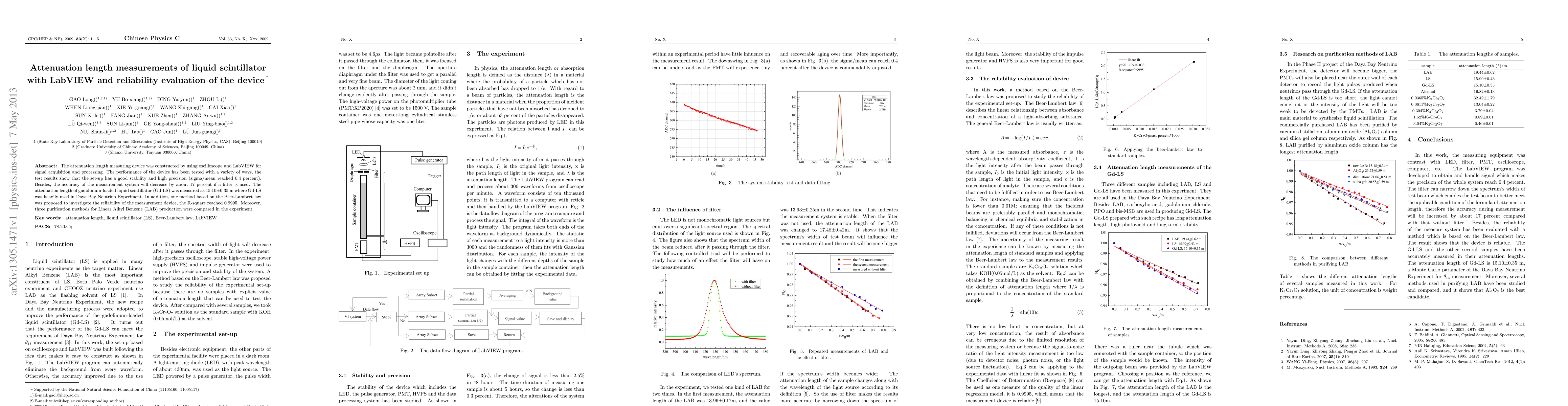 This paper details the construction of a device using an oscilloscope and LabVIEW for measuring the attenuation length of gadolinium-loaded liquid scintillator, achieving high precision. The reliability of the device was evaluated using the Beer-Lambert law, showing high accuracy, and various purification methods were compared.