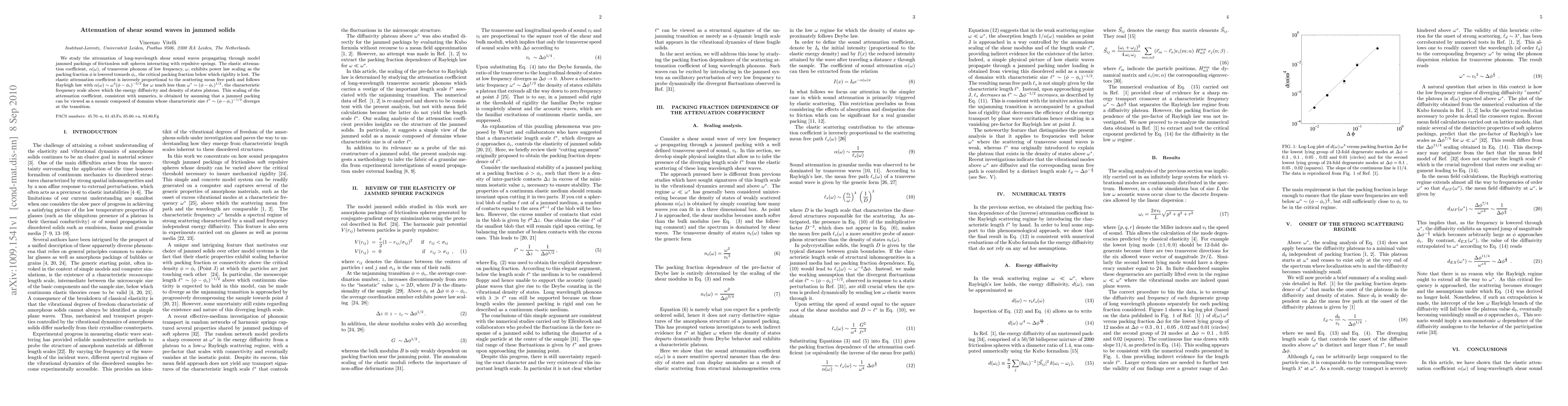 Research finds that shear sound waves in jammed solids attenuate as packing fraction decreases, following a power-law scaling relationship, and that the attenuation coefficient plateaus above a characteristic frequency scale.