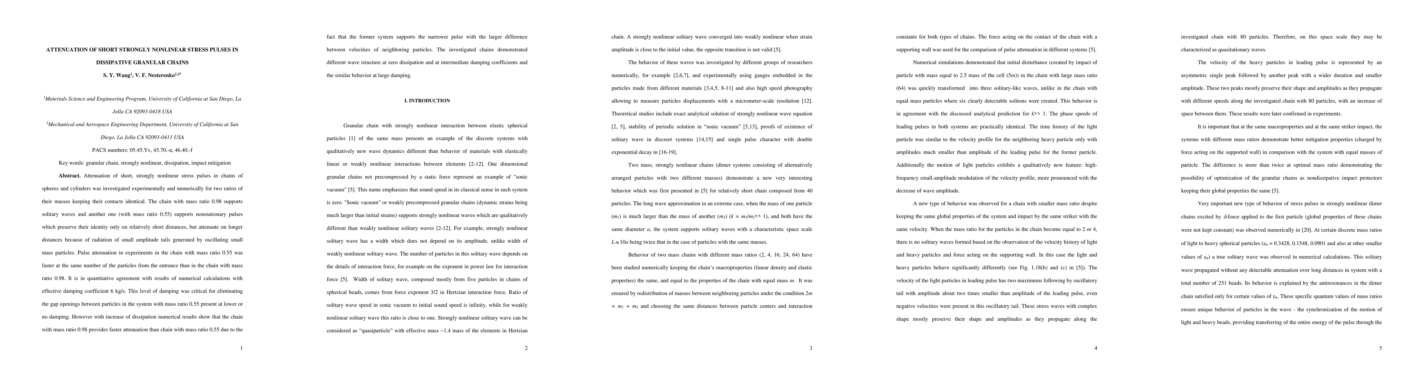 Attenuation of short, strongly nonlinear stress pulses in chains of spheres and cylinders was investigated experimentally and numerically for two ratios of their masses keeping their contacts identical. The chain with mass ratio 0.98 supports solitary waves and another one (with mass ratio 0.55) supports nonstationary pulses which preserve their identity only on relatively short distances, but attenuate on longer distances because of radiation of small amplitude tails generated by oscillating small mass particles. Pulse attenuation in experiments in the chain with mass ratio 0.55 was faster at the same number of the particles from the entrance than in the chain with mass ratio 0.98. It is in quantitative agreement with results of numerical calculations with effective damping coefficient 6 kg/s. This level of damping was critical for eliminating the gap openings between particles in the system with mass ratio 0.55 present at lower or no damping. However with increase of dissipation numerical results show that the chain with mass ratio 0.98 provides faster attenuation than chain with mass ratio 0.55 due to the fact that the former system supports the narrower pulse with the larger difference between velocities of neighboring particles. The investigated chains demonstrated different wave structure at zero dissipation and at intermediate damping coefficients and the similar behavior at large damping.