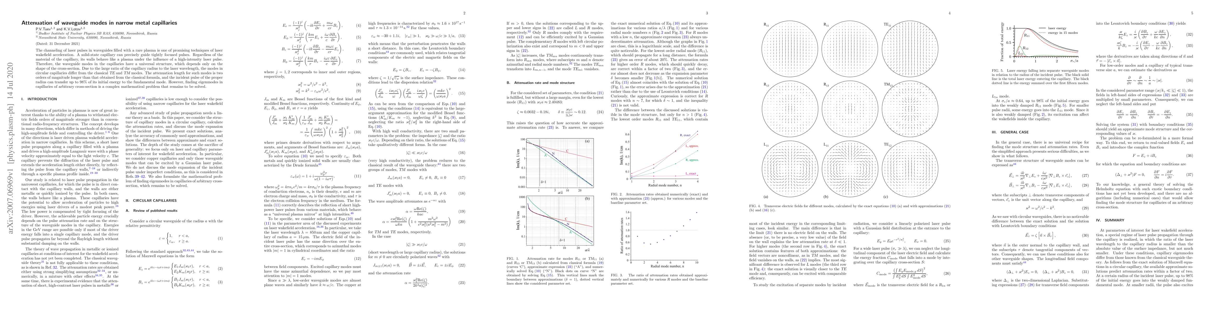The channeling of laser pulses in waveguides filled with a rare plasma is one of promising techniques of laser wakefield acceleration. A solid-state capillary can precisely guide tightly focused pulses. Regardless of the material of the capillary, its walls behave like a plasma under the influence of a high-intensity laser pulse. Therefore, the waveguide modes in the capillaries have a universal structure, which depends only on the shape of the cross-section. Due to the large ratio of the capillary radius to the laser wavelength, the modes in circular capillaries differ from the classical TE and TM modes. The attenuation length for such modes is two orders of magnitude longer than that obtained from the classical formula, and the incident pulse of the proper radius can transfer up to 98% of its initial energy to the fundamental mode. However, finding eigenmodes in capillaries of arbitrary cross-section is a complex mathematical problem that remains to be solved.