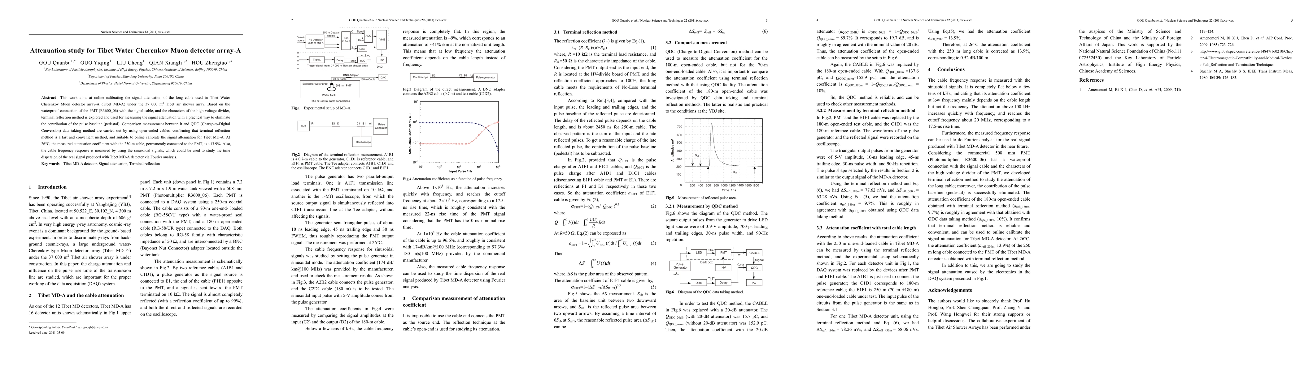 This study calibrates the signal attenuation in the long cables of Tibet Water Cherenkov Muon Detector Array-A using the terminal reflection method, demonstrating its effectiveness over QDC data methods. The measured attenuation coefficient for a 250-m cable is approximately 13.9% at 26°C, and the cable's frequency response is analyzed for time dispersion studies.