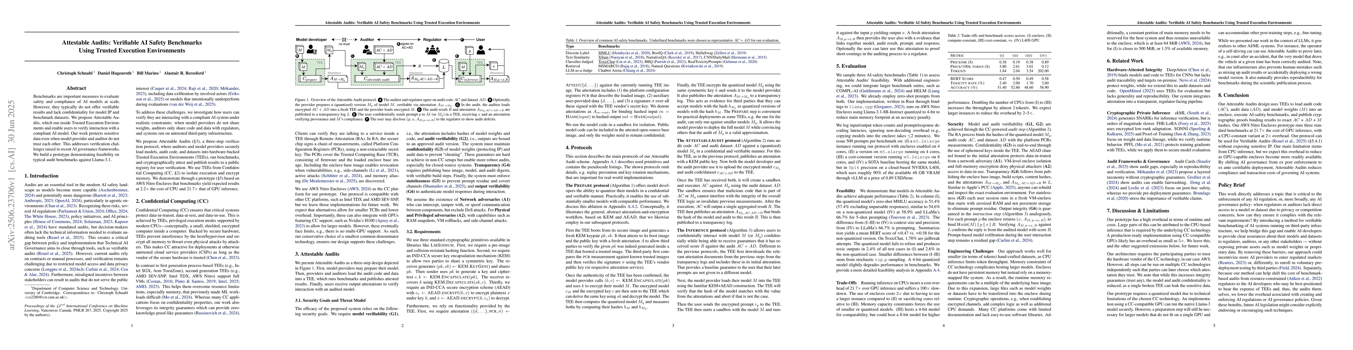 The research proposes Attestable Audits, a method utilizing Trusted Execution Environments (TEEs) to run AI safety benchmarks, ensuring verifiable results and confidentiality of model IP and datasets, even when the model provider and auditor do not trust each other.