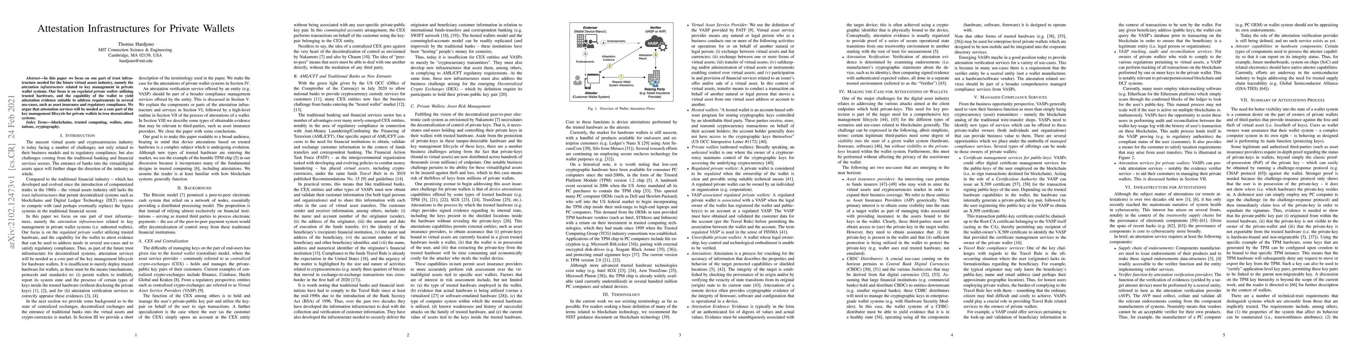 This paper explores the attestation infrastructure for regulated private wallets using trusted hardware, emphasizing its role in key management and its necessity for use-cases like asset insurance and regulatory compliance in the future virtual assets industry. It argues that attestation services will be integral to the key management lifecycle in decentralized systems.