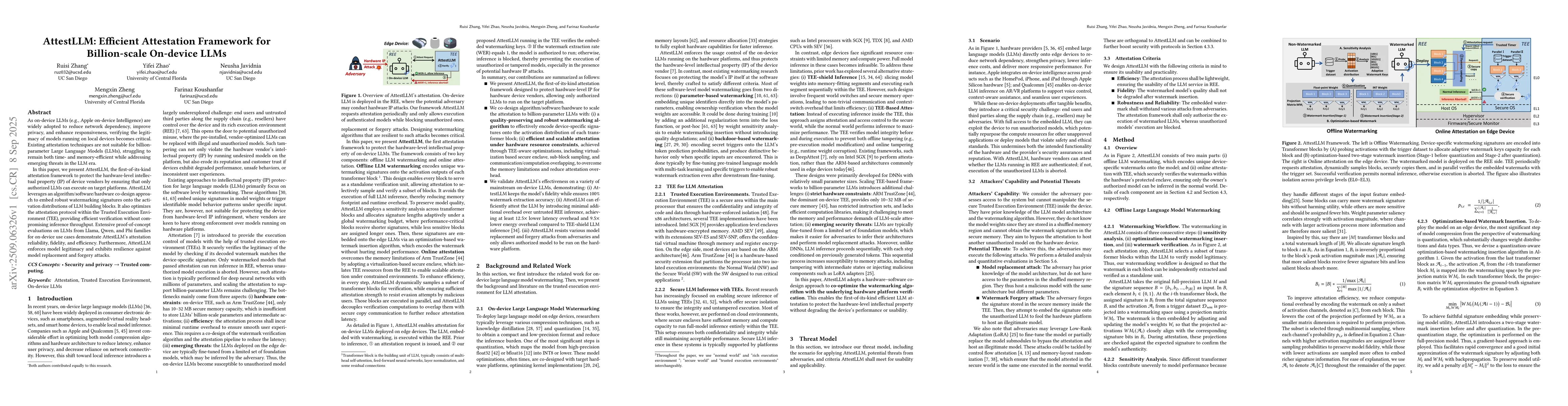 As on-device LLMs(e.g., Apple on-device Intelligence) are widely adopted to reduce network dependency, improve privacy, and enhance responsiveness, verifying the legitimacy of models running on local devices becomes critical. Existing attestation techniques are not suitable for billion-parameter Large Language Models (LLMs), struggling to remain both time- and memory-efficient while addressing emerging threats in the LLM era. In this paper, we present AttestLLM, the first-of-its-kind attestation framework to protect the hardware-level intellectual property (IP) of device vendors by ensuring that only authorized LLMs can execute on target platforms. AttestLLM leverages an algorithm/software/hardware co-design approach to embed robust watermarking signatures onto the activation distributions of LLM building blocks. It also optimizes the attestation protocol within the Trusted Execution Environment (TEE), providing efficient verification without compromising inference throughput. Extensive proof-of-concept evaluations on LLMs from Llama, Qwen, and Phi families for on-device use cases demonstrate AttestLLM's attestation reliability, fidelity, and efficiency. Furthermore, AttestLLM enforces model legitimacy and exhibits resilience against model replacement and forgery attacks.