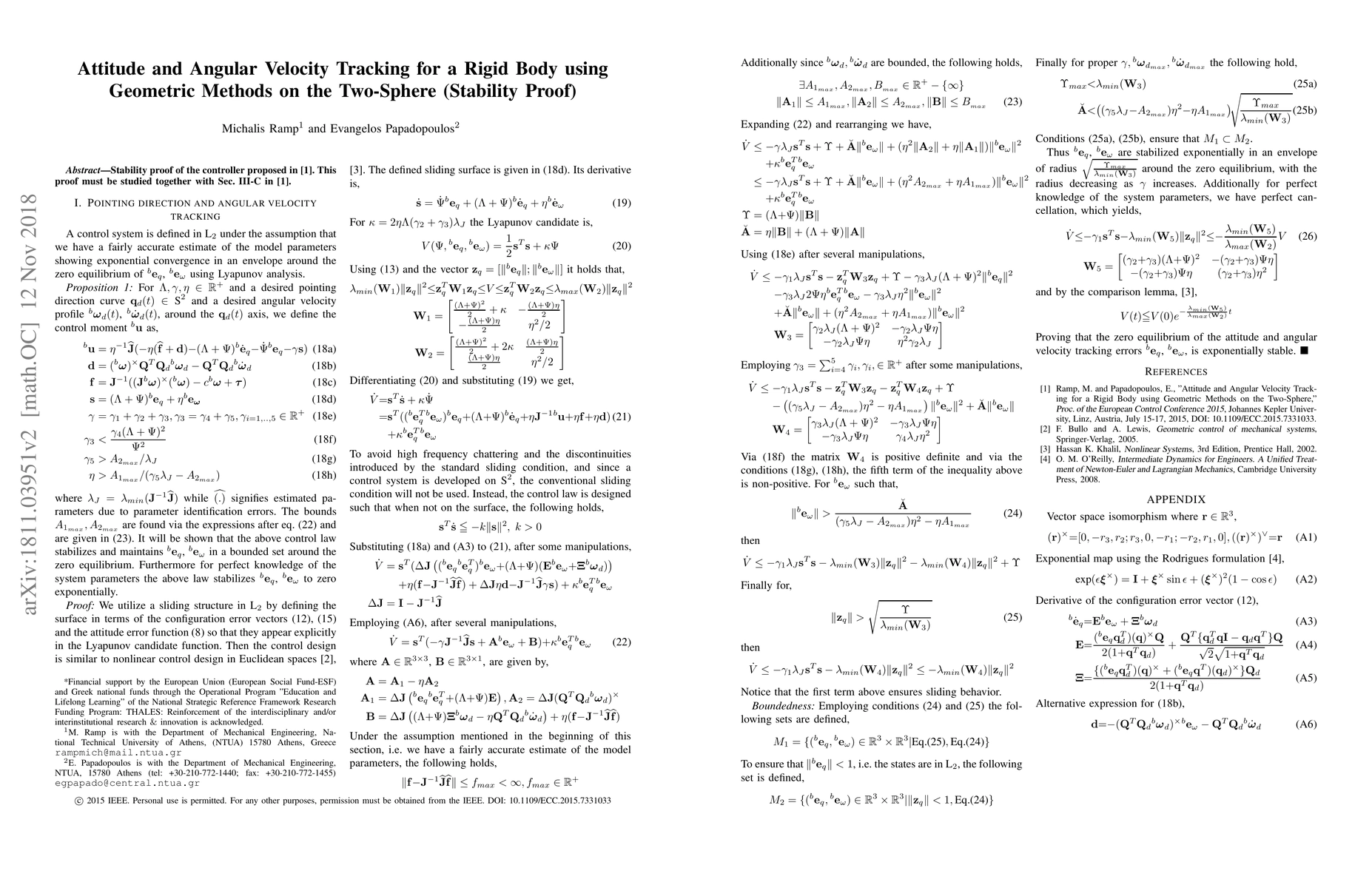 Stability proof of the controller proposed in the conference paper "Attitude and Angular Velocity Tracking for a Rigid Body using Geometric Methods on the Two-Sphere", DOI: 10.1109/ECC.2015.7331033. This proof must be studied together with Sec. III-C in the aforementioned paper.