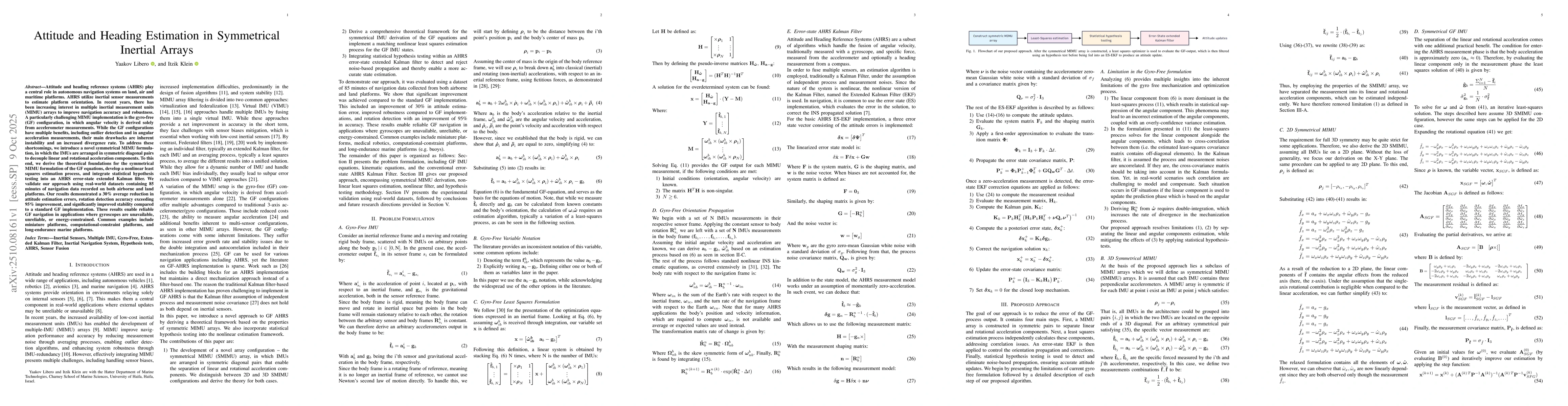 Introduces a symmetrical MIMU array that independently estimates linear and rotational components, along with hypothesis testing for rotation detection, which is a novel approach in gyro-free navigation systems.