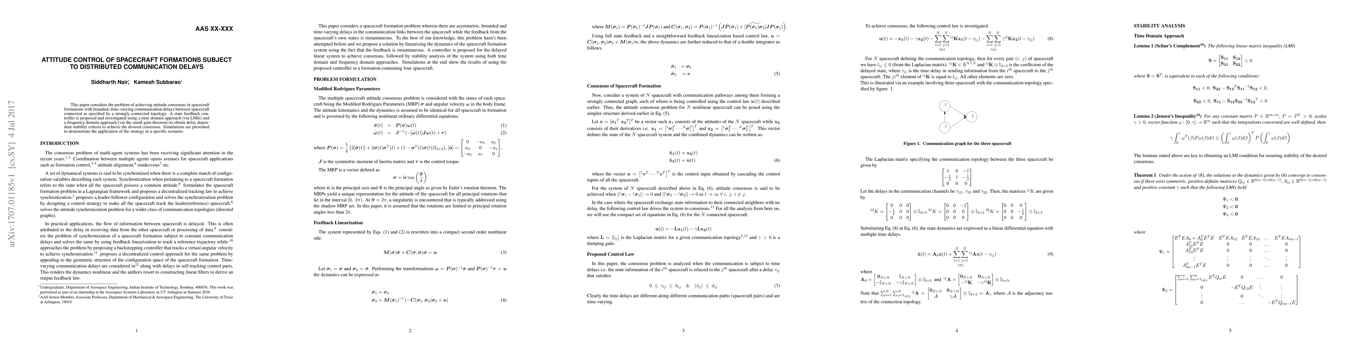 This paper proposes a state feedback controller for achieving attitude consensus in spacecraft formations with communication delays, utilizing both time and frequency domain approaches to establish stability criteria. Simulation results validate the effectiveness of the proposed strategy.
