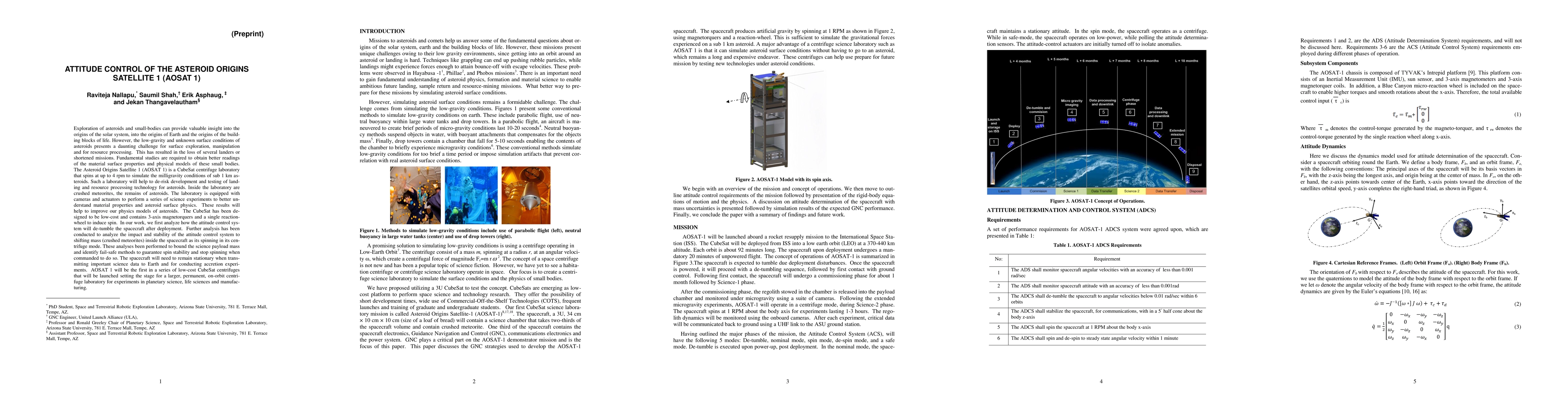 The paper discusses the attitude control system for AOSAT 1, a CubeSat centrifuge designed to simulate milligravity for asteroid exploration. The system uses magnetorquers and a reaction wheel to stabilize the satellite and compensate for shifting mass due to the centrifuge's operation, aiming to de-risk future asteroid landing and resource processing technologies.