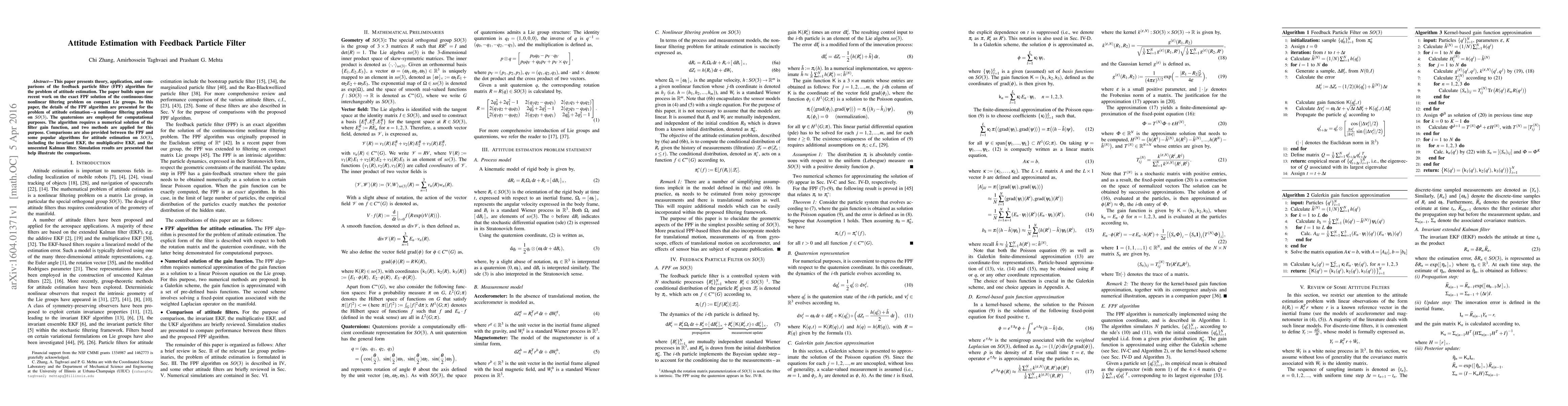 This paper details the feedback particle filter (FPF) algorithm for attitude estimation, employing quaternions and comparing it with the invariant EKF, multiplicative EKF, and unscented Kalman filter through simulations to demonstrate its effectiveness.