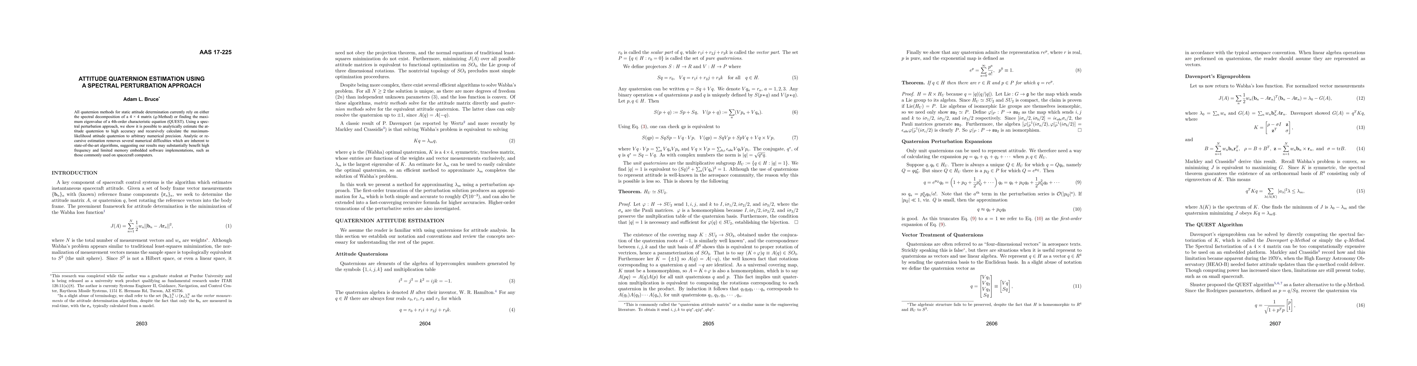 The spectral perturbation approach for estimating attitude quaternions, which analytically removes numerical difficulties from existing methods.