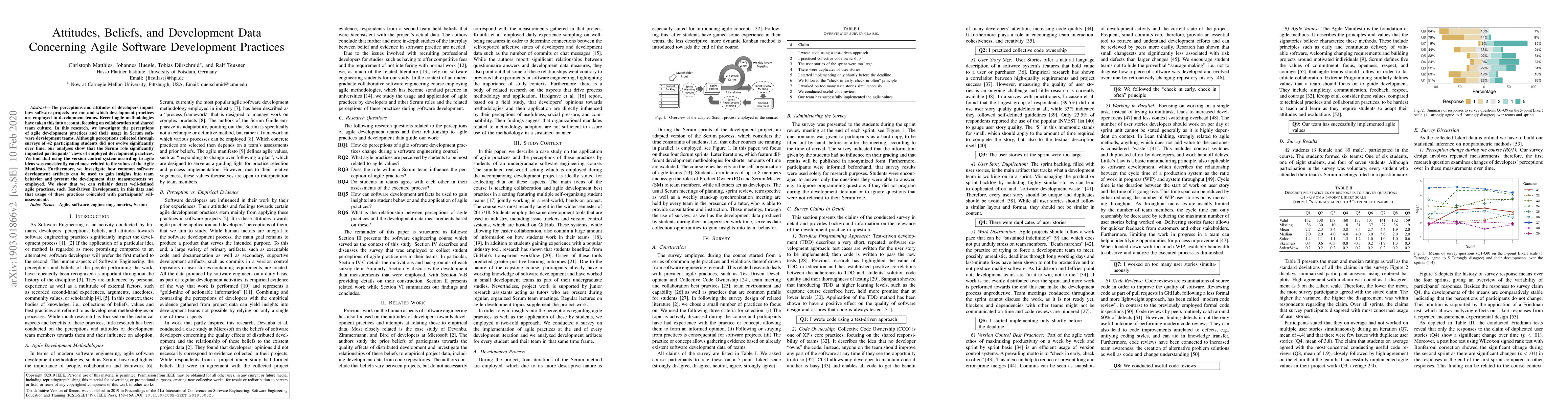 This study examines the perceptions of agile development practices within Scrum teams, finding that Scrum roles significantly influence these views. Despite no significant change in attitudes over time among surveyed students, the version control system's agile-aligned use was rated highest in alignment with Agile Manifesto values. The research also highlights the potential of software development artifacts to provide insights into team behavior.