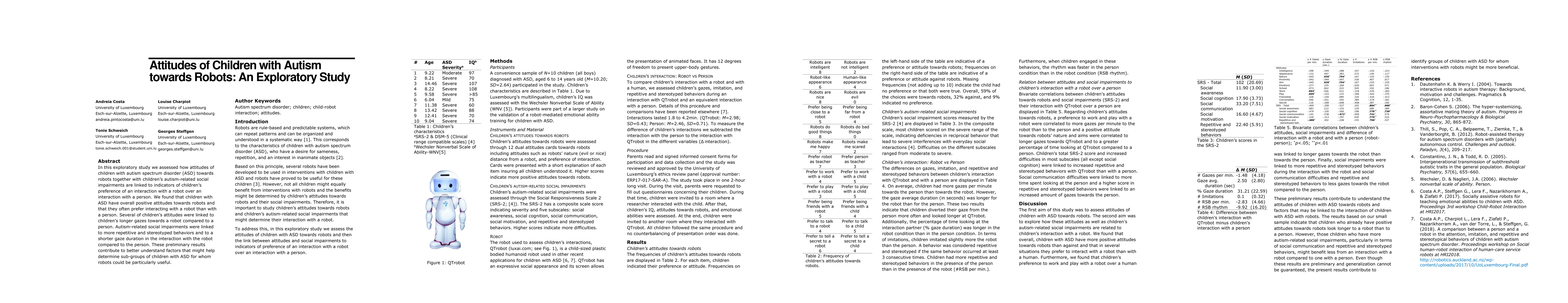This study explores the attitudes of children with autism spectrum disorder towards robots, finding they generally have positive attitudes and prefer robot interactions over human ones. Autism-related social impairments correlate with more repetitive behaviors and shorter gaze durations towards robots.