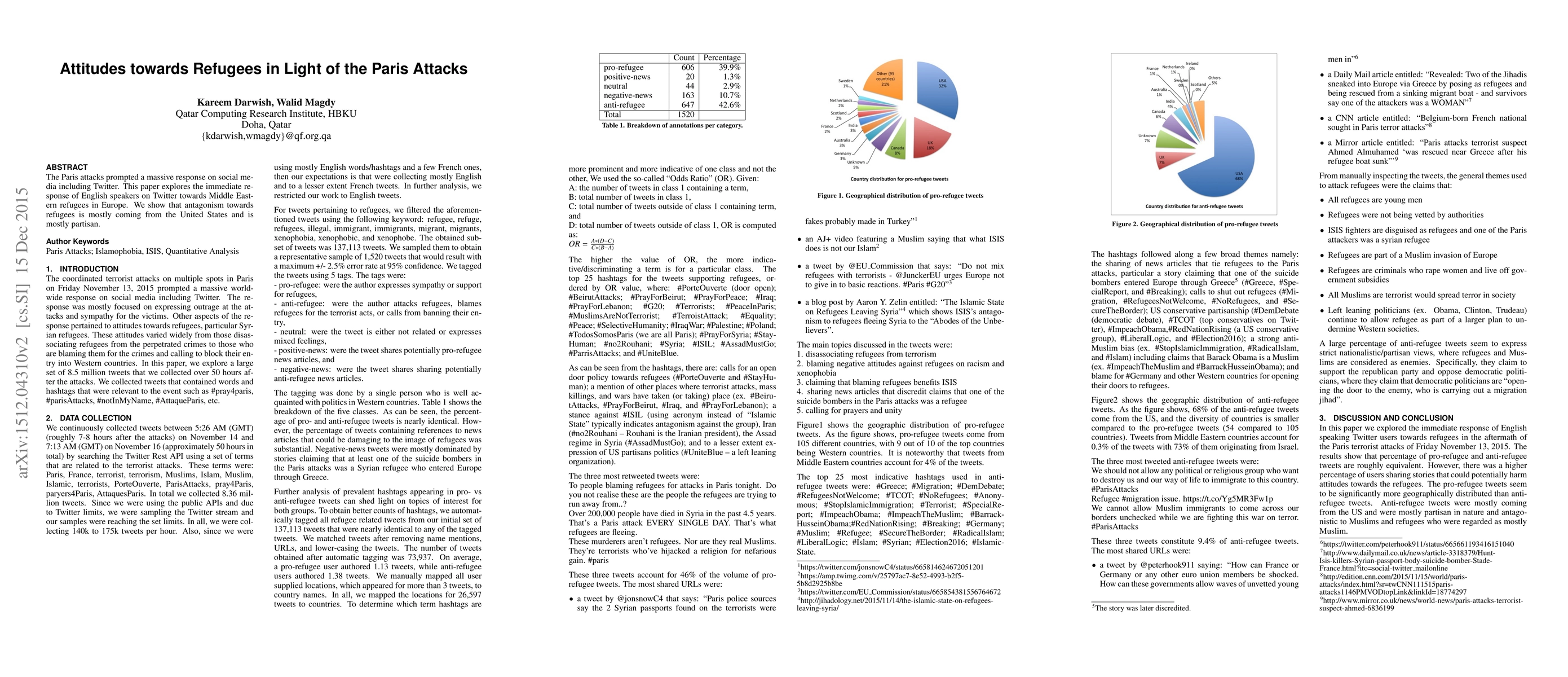 Summary: This study examines the Twitter responses of English speakers following the Paris attacks, revealing a significant and partisan antagonism towards Middle Eastern refugees in Europe, particularly from the United States. The research highlights the role of social media in shaping public attitudes during crises.