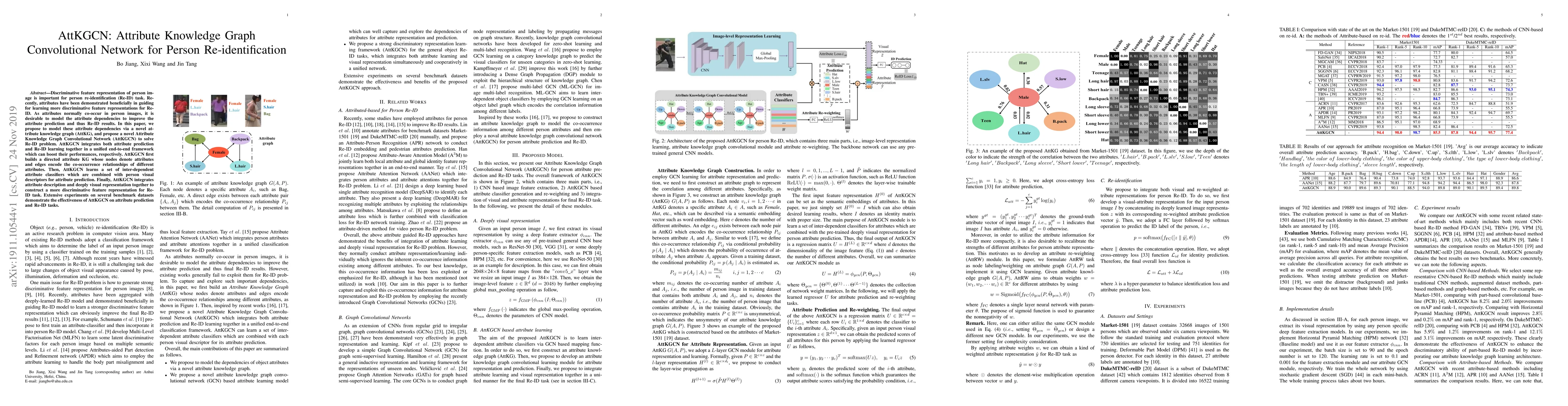 The paper proposes AttKGCN, an Attribute Knowledge Graph Convolutional Network, to enhance person re-identification by modeling attribute dependencies through an attribute knowledge graph. AttKGCN integrates attribute prediction and Re-ID learning, achieving improved performance in both tasks.