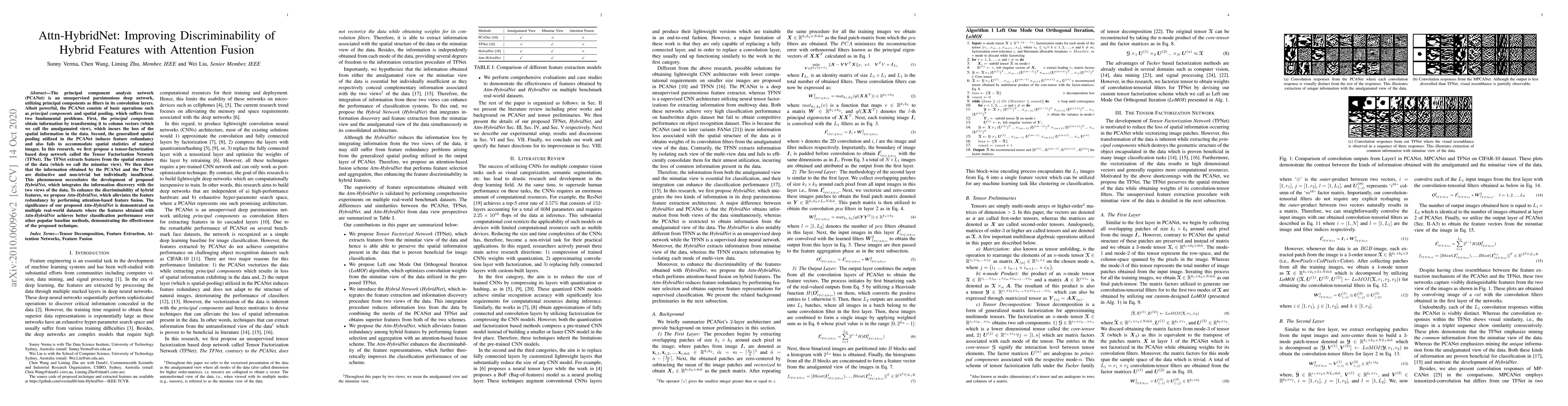 The principal component analysis network (PCANet) is an unsupervised parsimonious deep network, utilizing principal components as filters in its convolution layers. Albeit powerful, the PCANet consists of basic operations such as principal components and spatial pooling, which suffers from two fundamental problems. First, the principal components obtain information by transforming it to column vectors (which we call the amalgamated view), which incurs the loss of the spatial information in the data. Second, the generalized spatial pooling utilized in the PCANet induces feature redundancy and also fails to accommodate spatial statistics of natural images. In this research, we first propose a tensor-factorization based deep network called the Tensor Factorization Network (TFNet). The TFNet extracts features from the spatial structure of the data (which we call the minutiae view). We then show that the information obtained by the PCANet and the TFNet are distinctive and non-trivial but individually insufficient. This phenomenon necessitates the development of proposed HybridNet, which integrates the information discovery with the two views of the data. To enhance the discriminability of hybrid features, we propose Attn-HybridNet, which alleviates the feature redundancy by performing attention-based feature fusion. The significance of our proposed Attn-HybridNet is demonstrated on multiple real-world datasets where the features obtained with Attn-HybridNet achieves better classification performance over other popular baseline methods, demonstrating the effectiveness of the proposed technique.