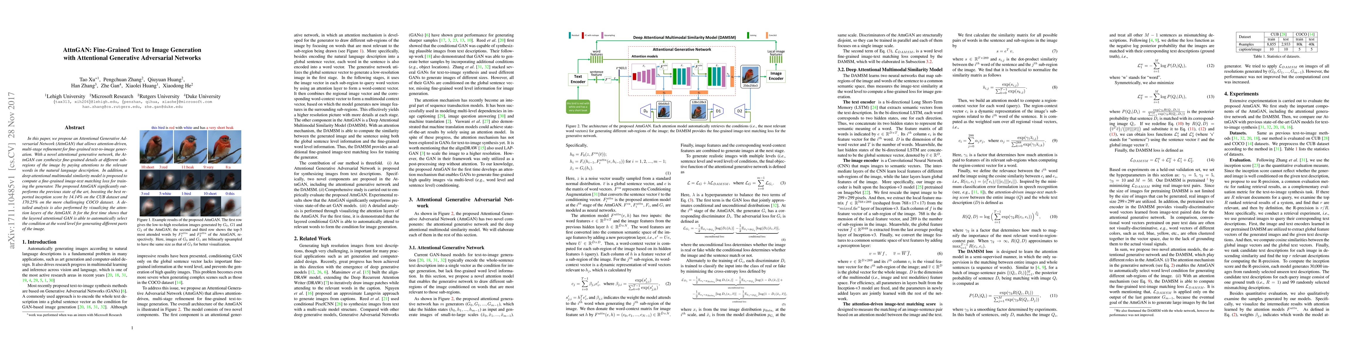 AttnGAN introduces an attention-driven, multi-stage refinement method for fine-grained text-to-image generation, significantly outperforming previous models by synthesizing fine-grained details based on relevant words in the description. The method achieves notable improvements in inception scores on CUB and COCO datasets.