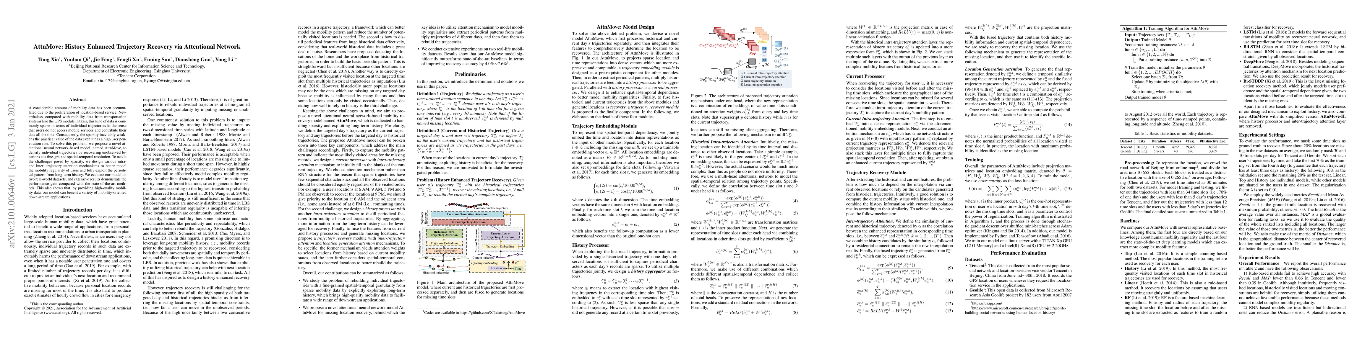 AttnMove is a novel attentional neural network designed to recover sparse individual mobility trajectories by filling in unobserved locations. It employs intra- and inter-trajectory attention mechanisms to model user mobility patterns and enhance data utility, demonstrating superior performance over state-of-the-art methods on real-world datasets.