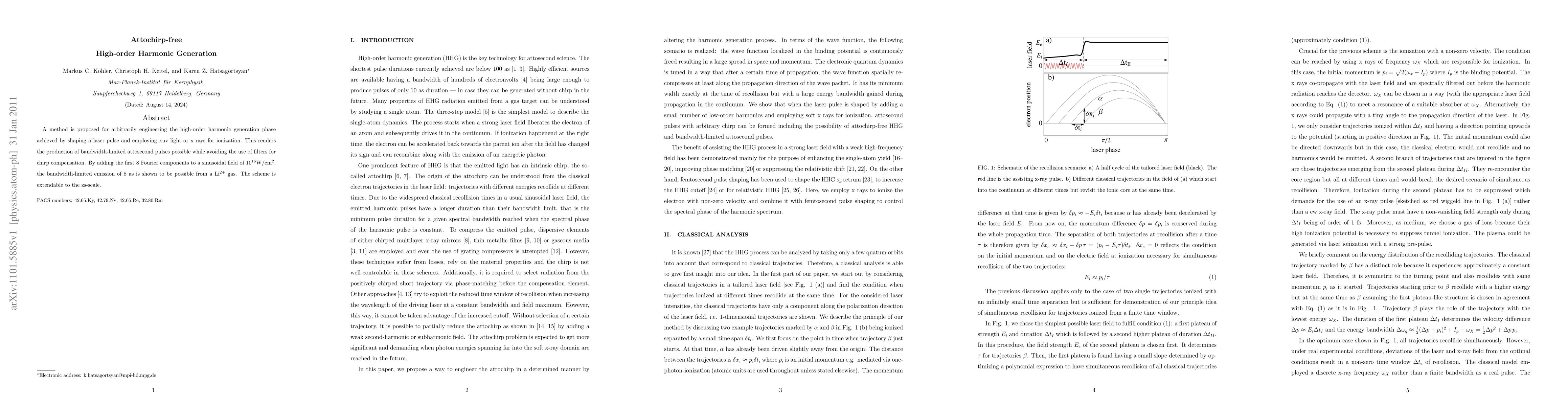 A method is proposed for arbitrarily engineering the high-order harmonic generation phase achieved by shaping a laser pulse and employing xuv light or x rays for ionization. This renders the production of bandwidth-limited attosecond pulses possible while avoiding the use of filters for chirp compensation. By adding the first 8 Fourier components to a sinusoidal field of $10^{16}$W/cm$^2$, the bandwidth-limited emission of 8 as is shown to be possible from a Li$^{2+}$ gas. The scheme is extendable to the zs-scale.